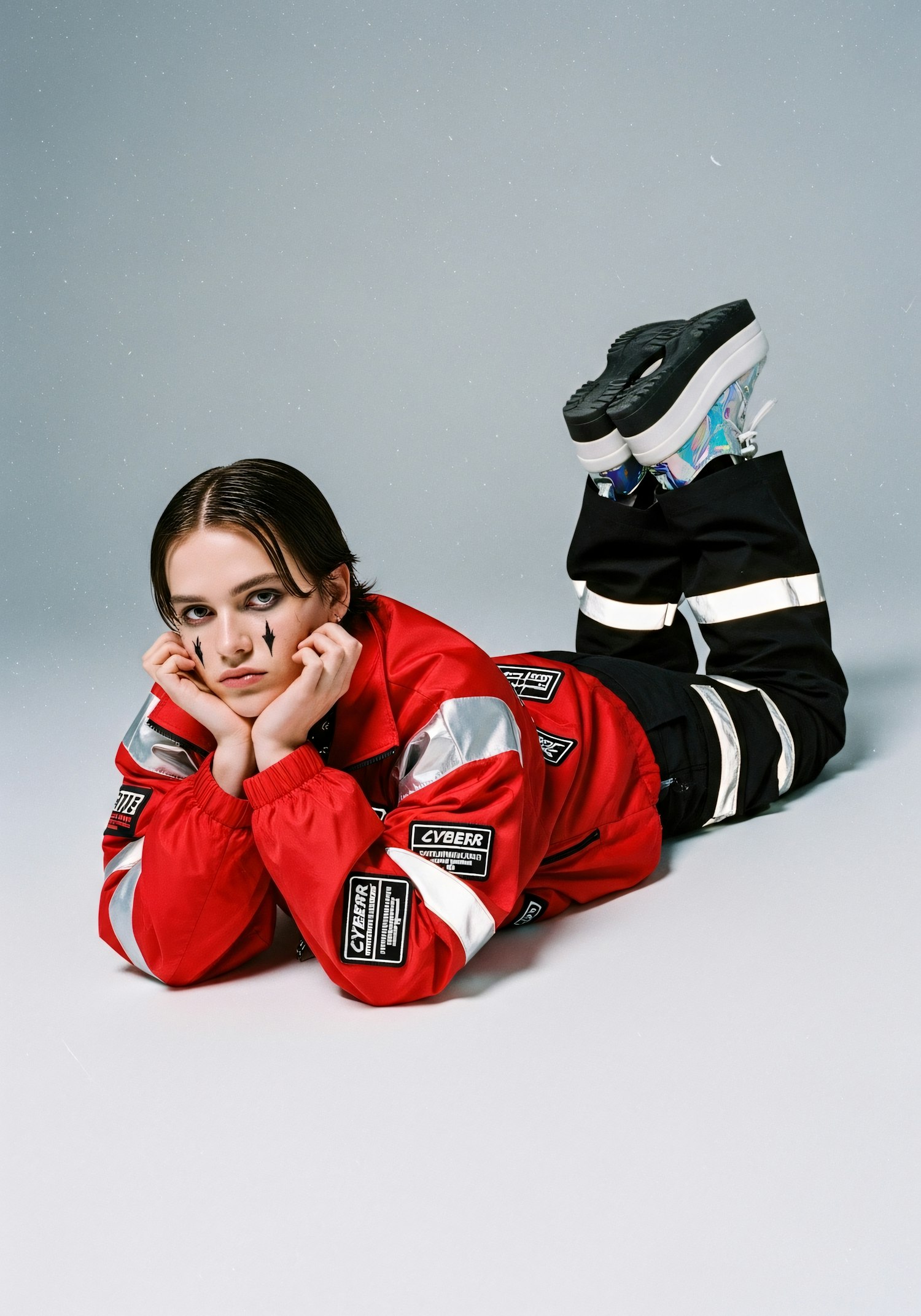 A person in a red jacket with reflective accents and holographic shoes lies on a neutral background, showcasing a bold, modern style.