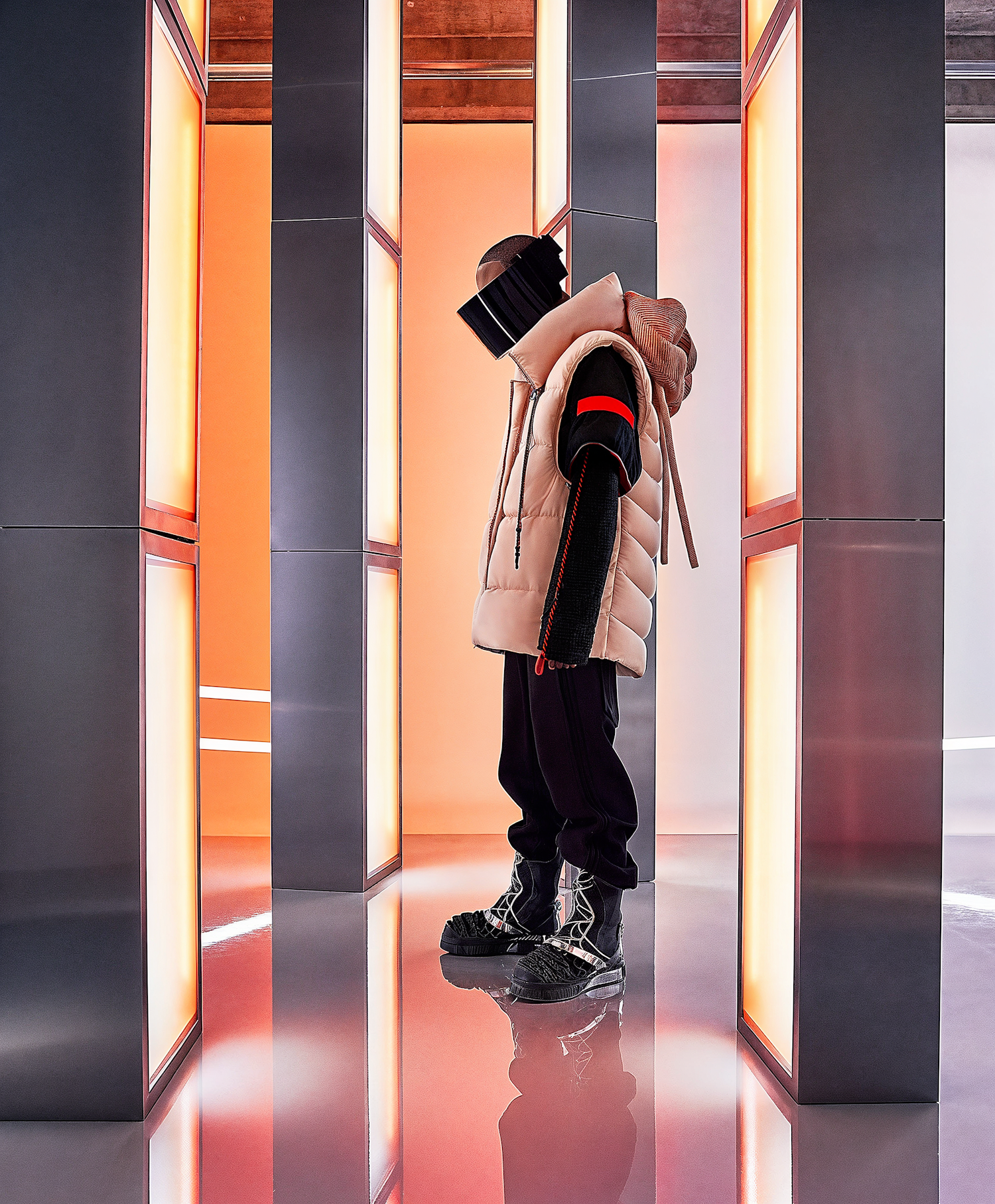 Futuristic fashion scene with a person in a beige puffer vest and black visor, surrounded by glowing orange panels.