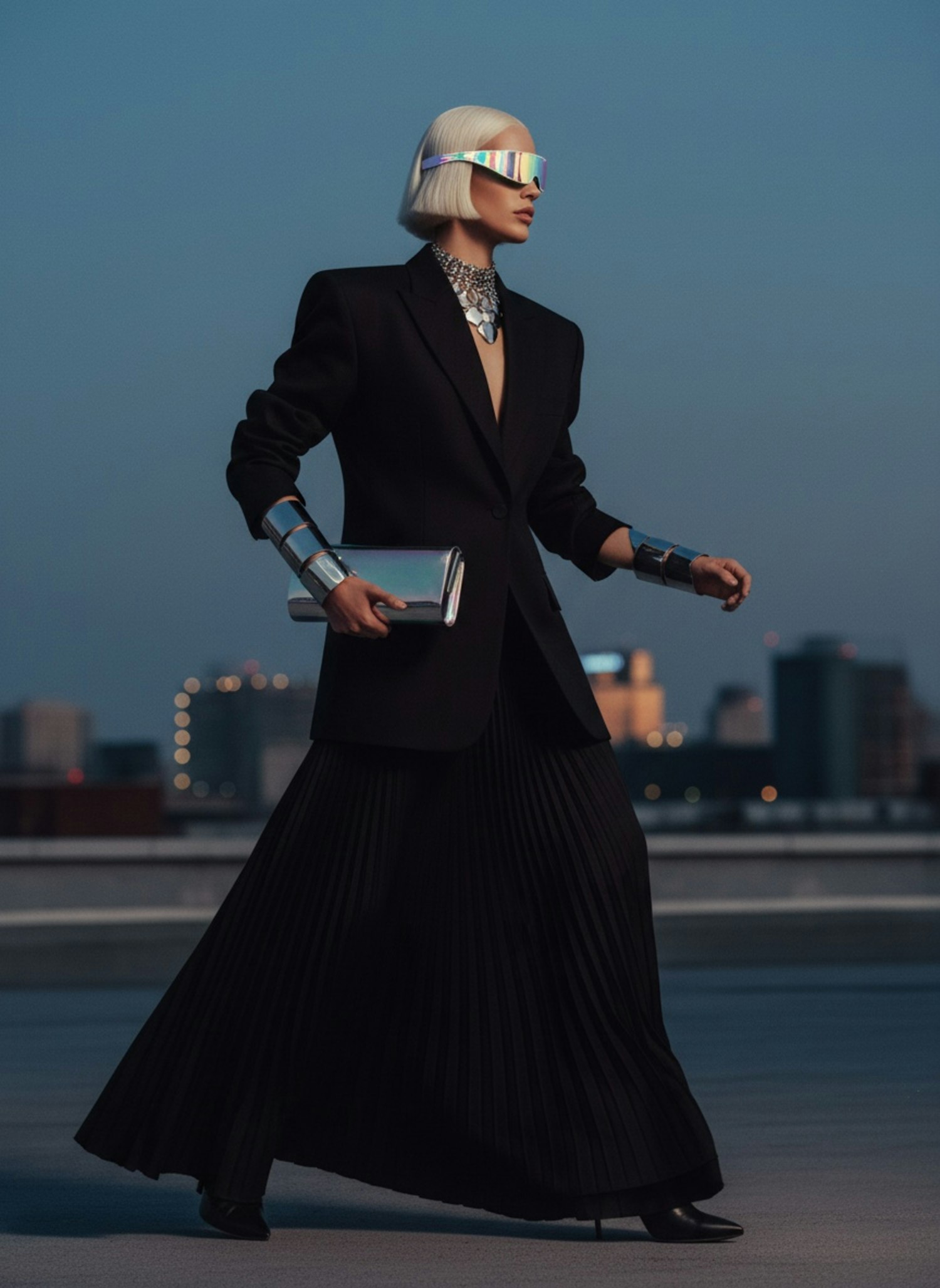A futuristic fashion look with a black blazer, pleated skirt, and metallic accessories, set against a twilight cityscape.