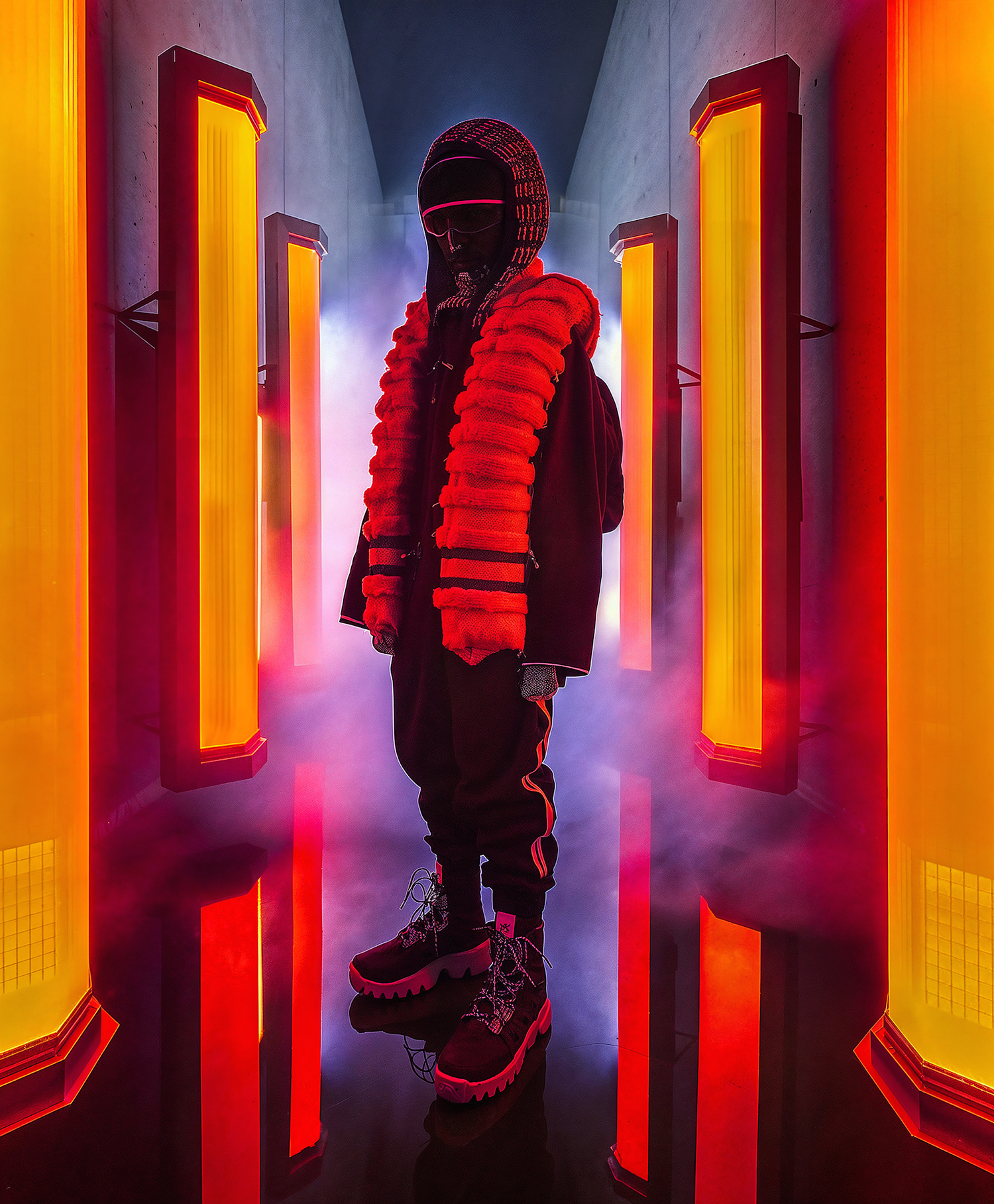 Futuristic scene with a masked figure in a neon-lit corridor, wearing a red fur vest and surrounded by glowing orange panels.
