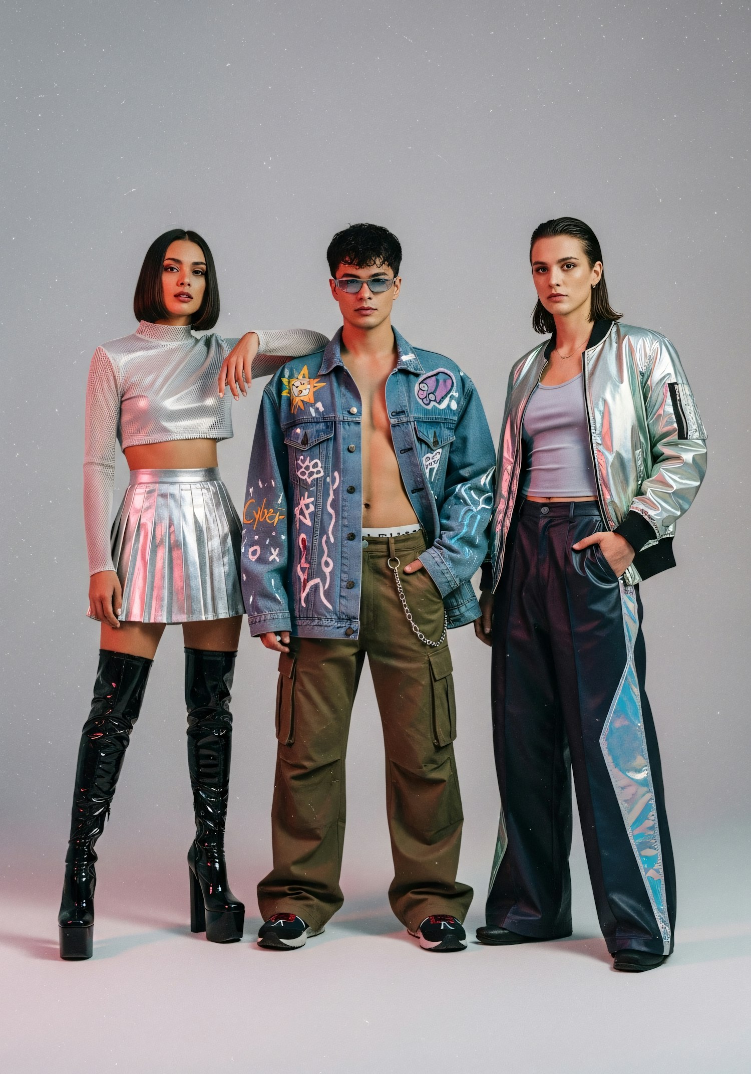 Three individuals in futuristic and stylish outfits pose confidently in a studio setting, showcasing modern and bold fashion trends.