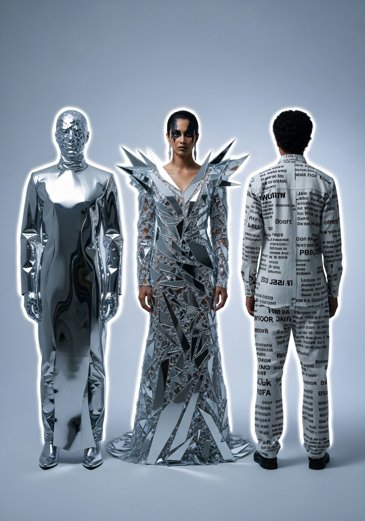 Three individuals in futuristic outfits: a mirrored suit, a shard-like dress, and a text-covered ensemble, in a glowing studio setting.