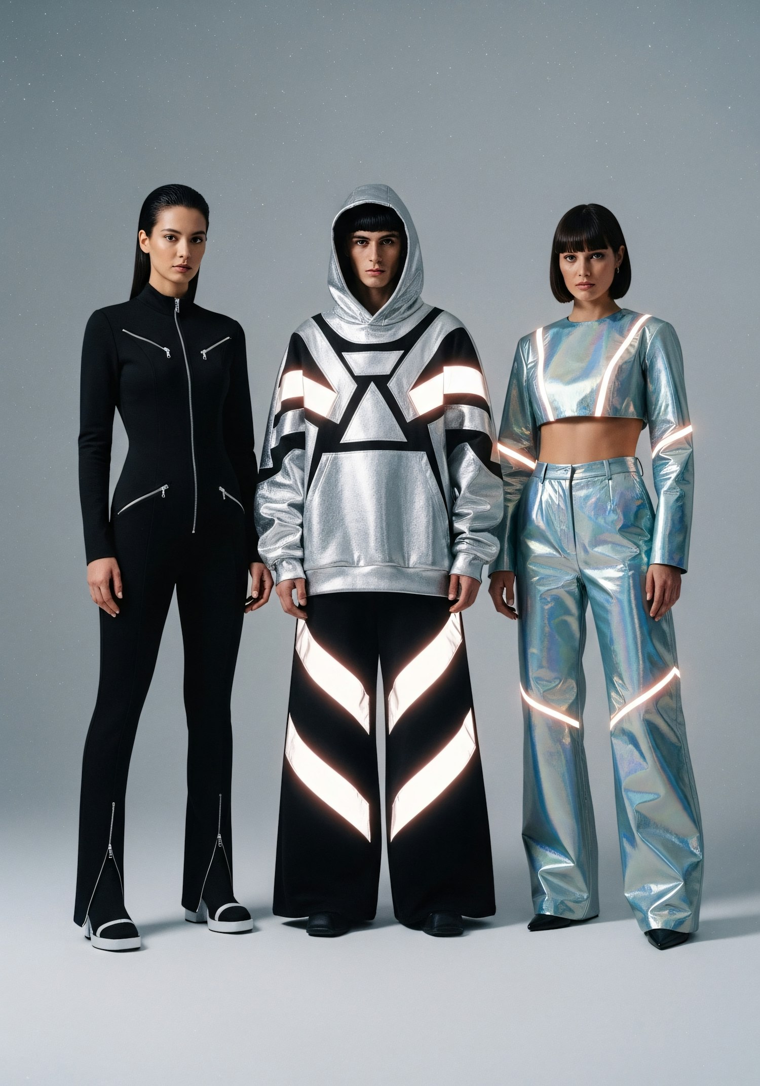 Three individuals in futuristic reflective outfits, featuring sleek black, metallic silver, and iridescent designs, in a studio setting.