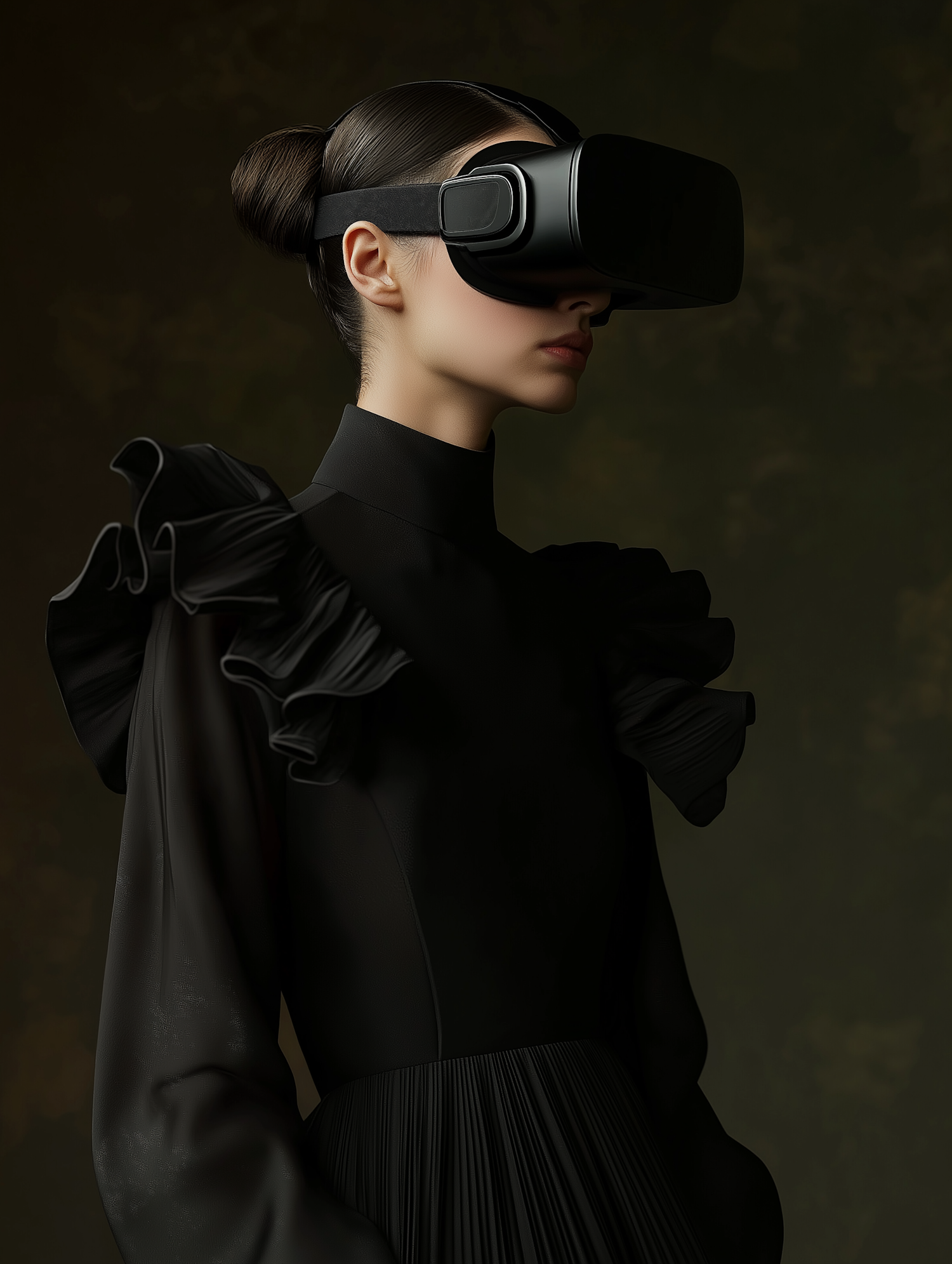Elegant woman in black dress wearing a VR headset, blending fashion with technology in a sophisticated setting.