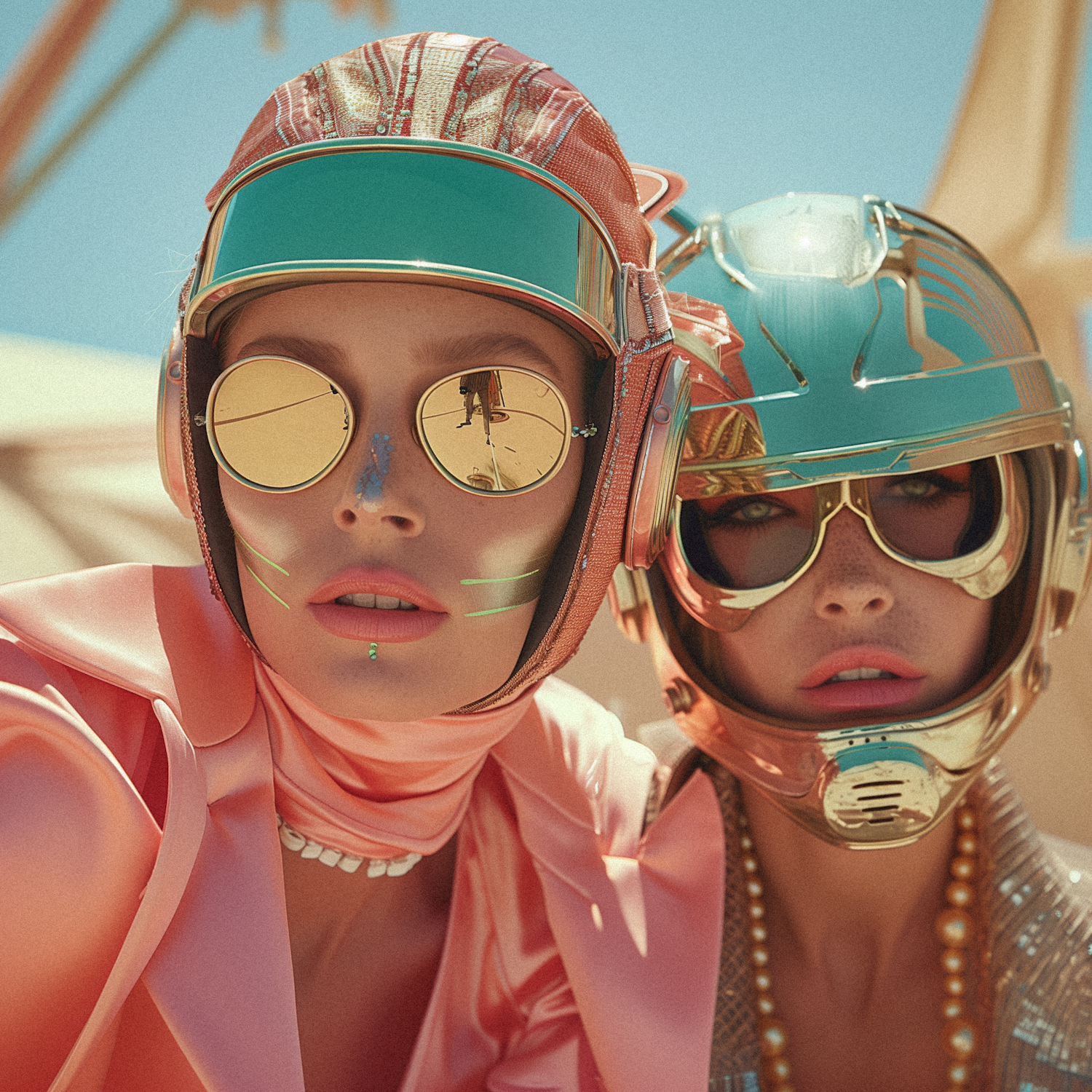 Two women in futuristic helmets and reflective sunglasses, styled in bold, avant-garde fashion with metallic and pearl accents.