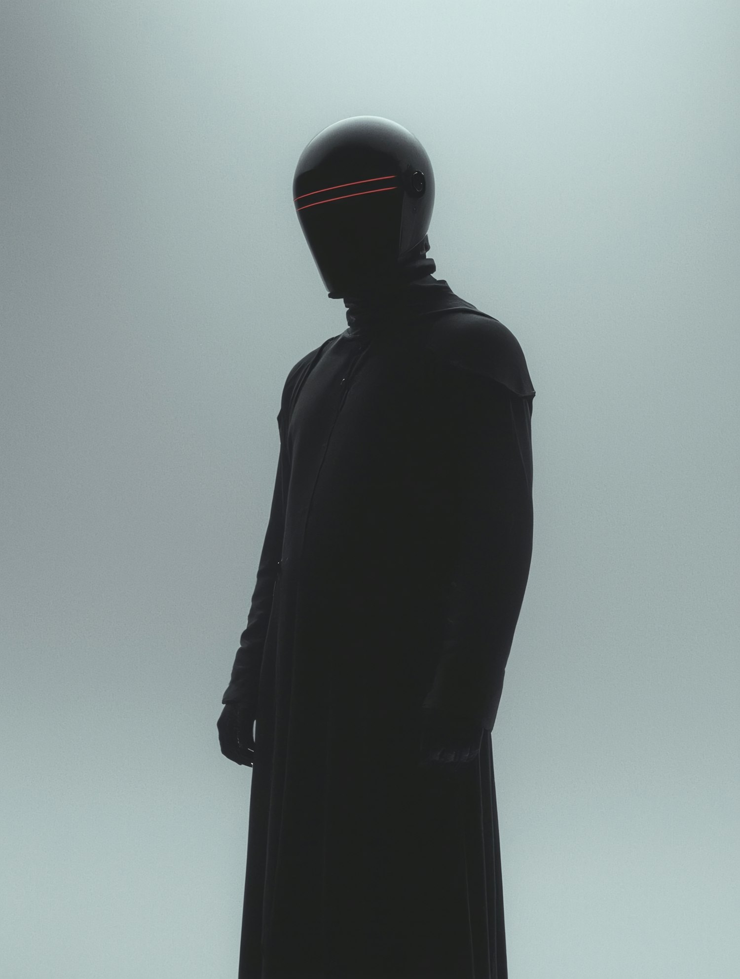 A mysterious figure in a black outfit and helmet with a red visor stands against a minimal gray background, evoking a futuristic vibe.