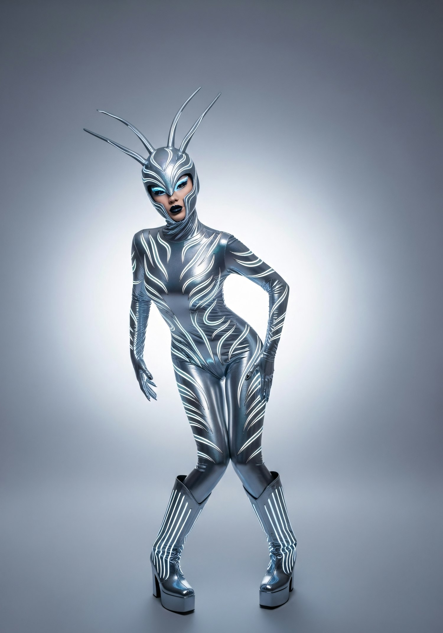 A futuristic figure in a glowing metallic bodysuit with intricate patterns and a helmet, set against a cool-toned gradient background.