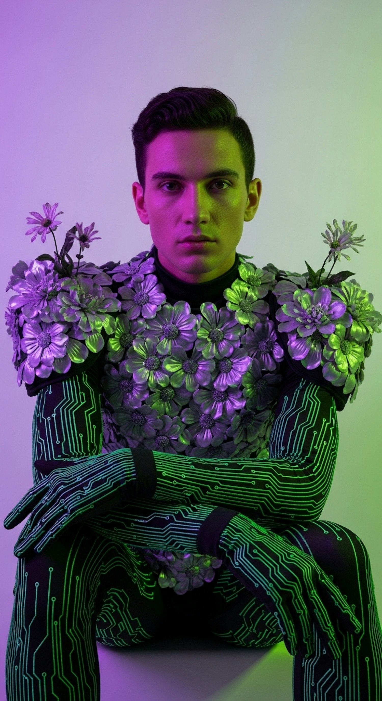 A striking blend of technology and nature with futuristic wear adorned in flowers and vibrant circuit board patterns in bold lighting.