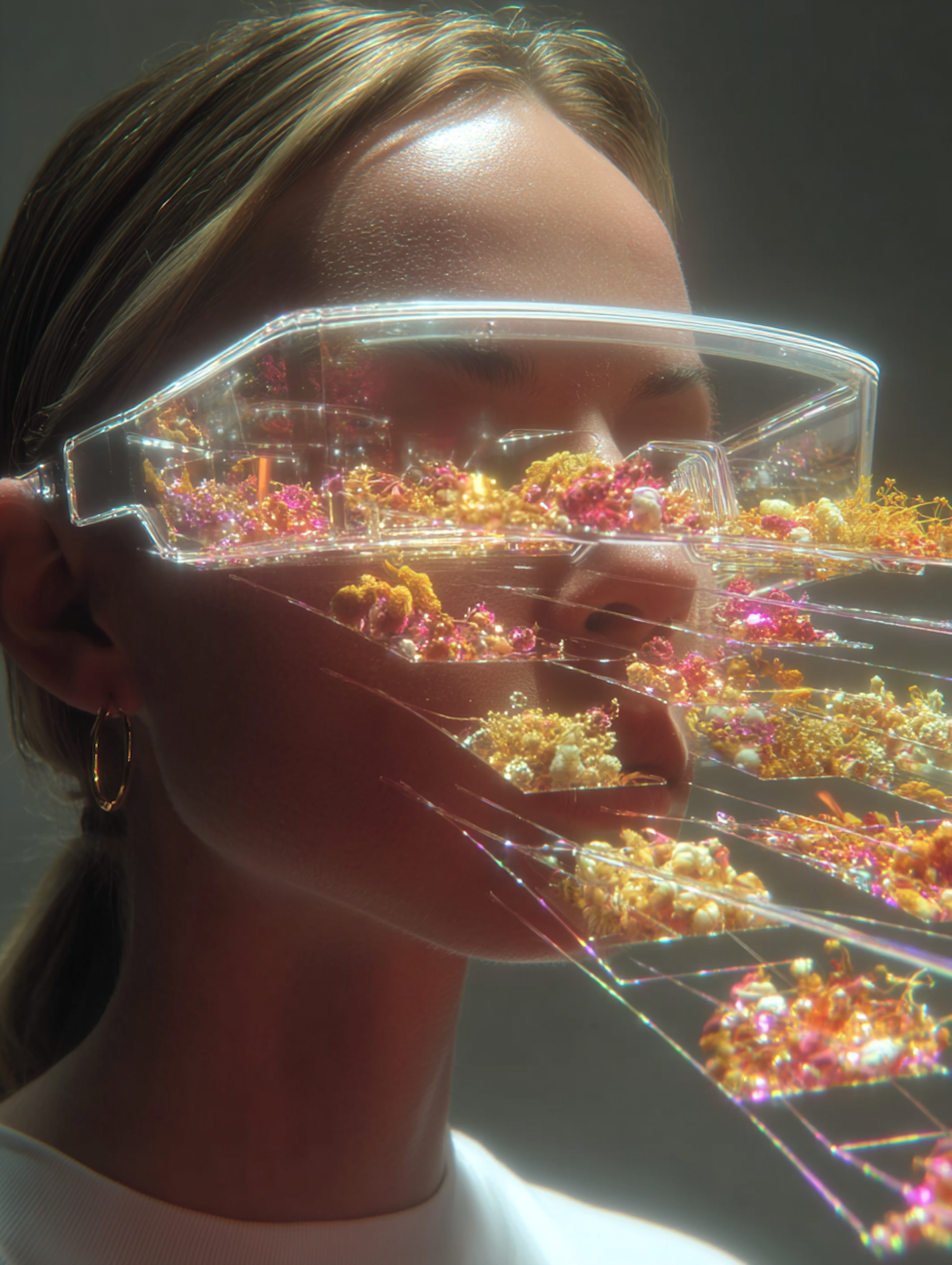 A futuristic visor with intricate floral designs worn by a person, blending technology and art in a glowing, ethereal composition.