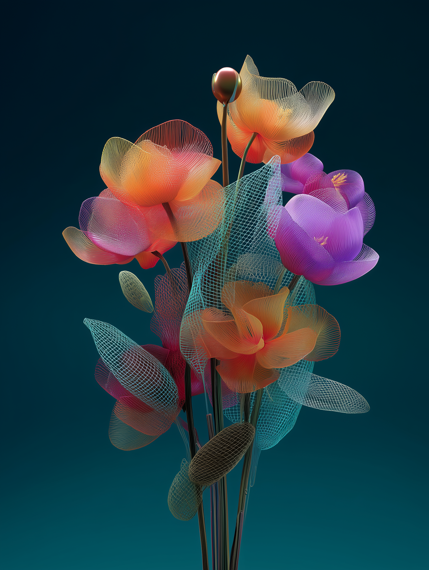 A stunning digital bouquet with mesh-like flowers in vivid colors against a deep teal background, blending art and technology beautifully.