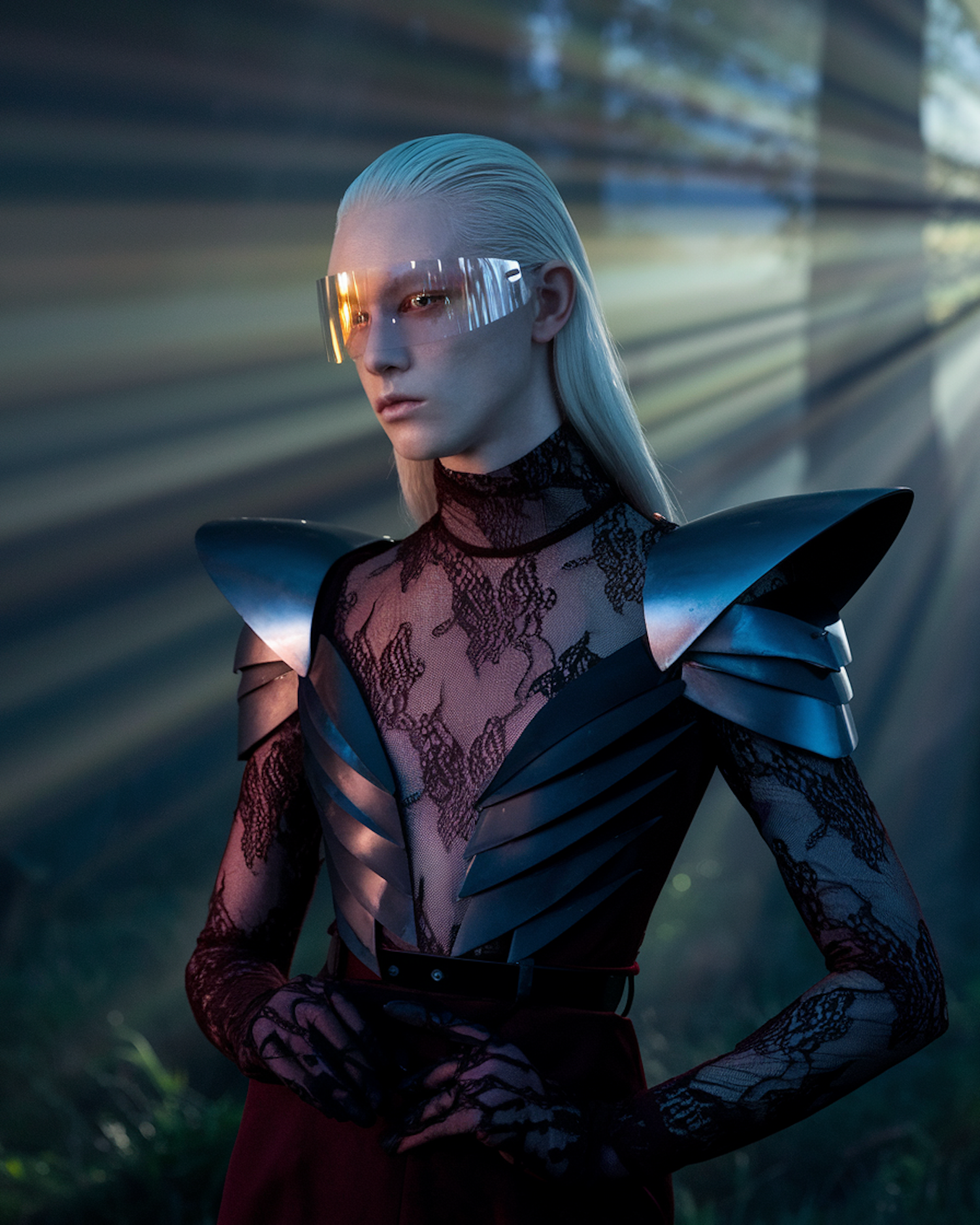 A futuristic figure in metallic armor and lace stands in a misty forest, wearing sleek visor glasses and bathed in ethereal light rays.