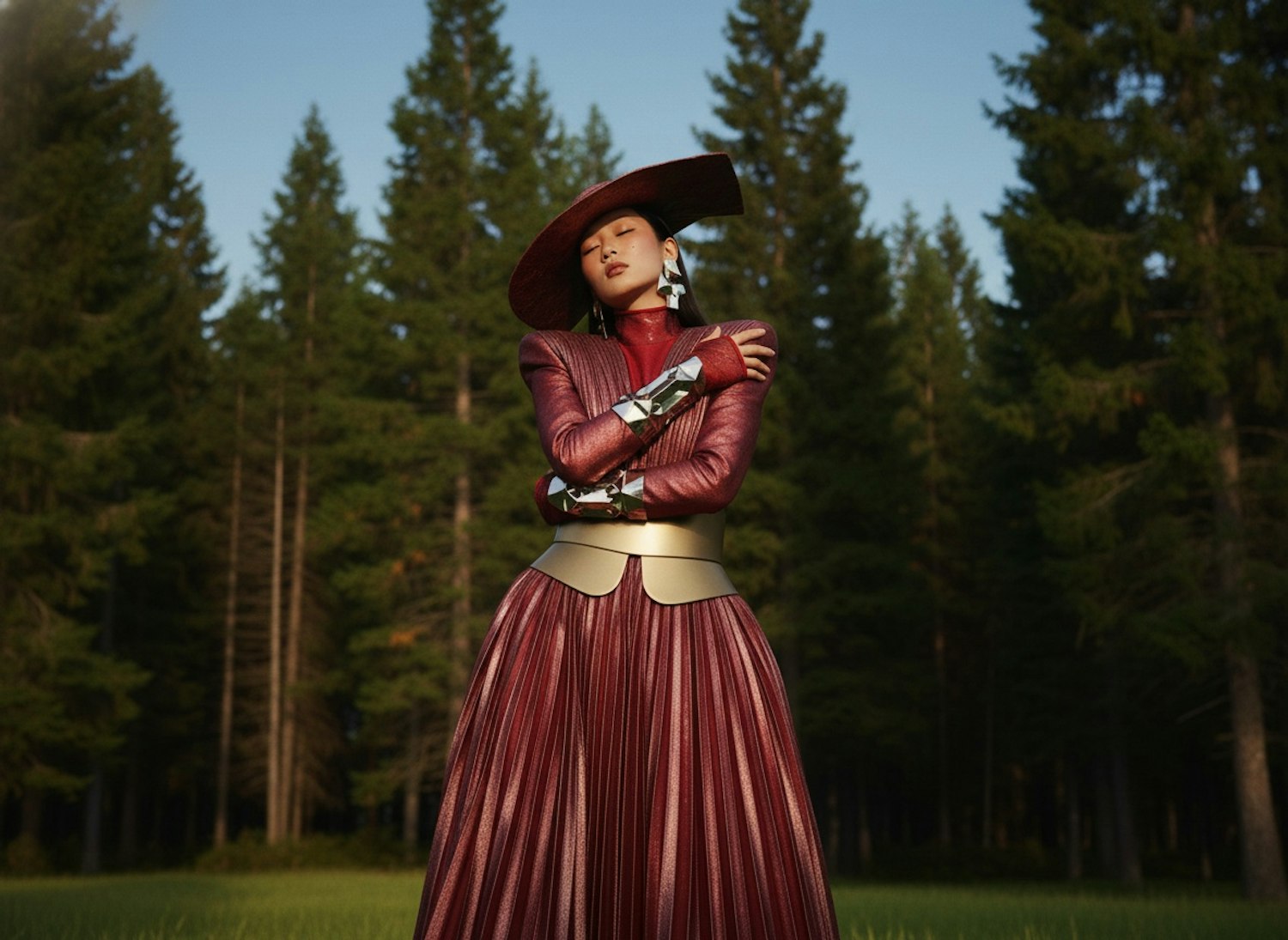 A person in a metallic red outfit and wide-brimmed hat stands in a forest, blending futuristic fashion with a serene natural setting.