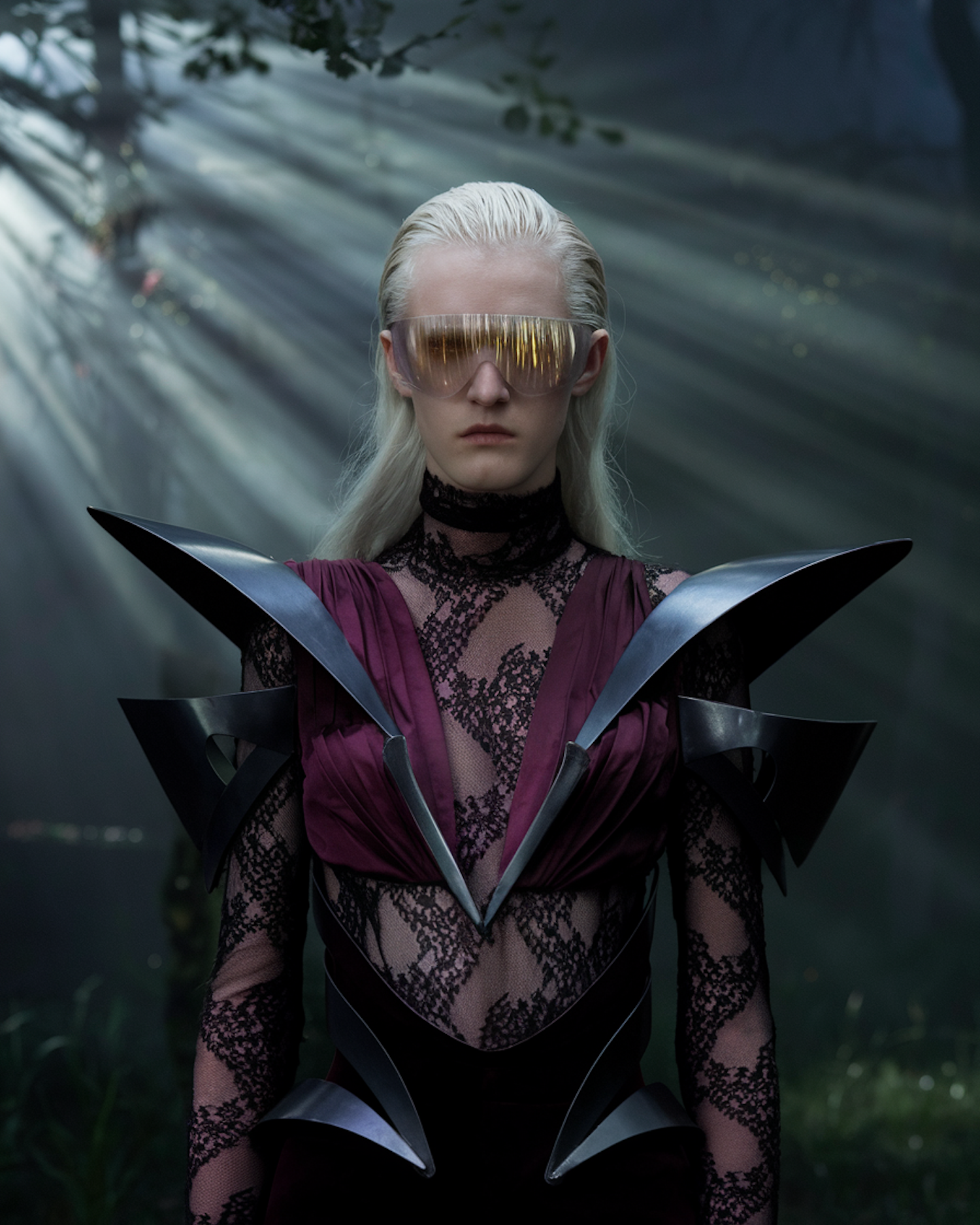 Futuristic figure in a forest, wearing metallic armor, sheer lace, and gold visor glasses, with sunlight streaming through the trees.