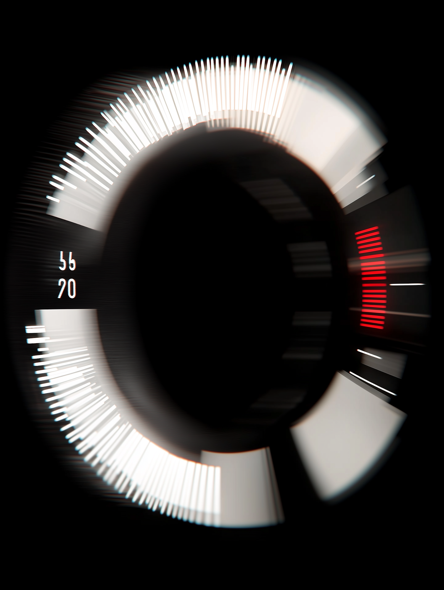 Abstract futuristic gauge with white and red illuminated bars on black, evoking speed and technology. Numbers add a functional touch.