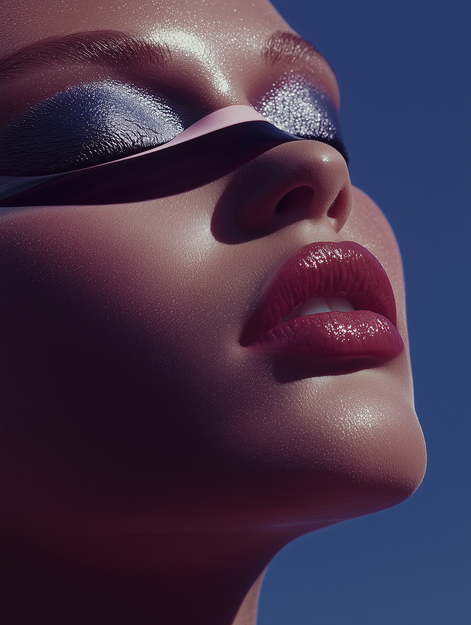 Close-up of a woman's face with glossy makeup and a futuristic visor against a deep blue background.