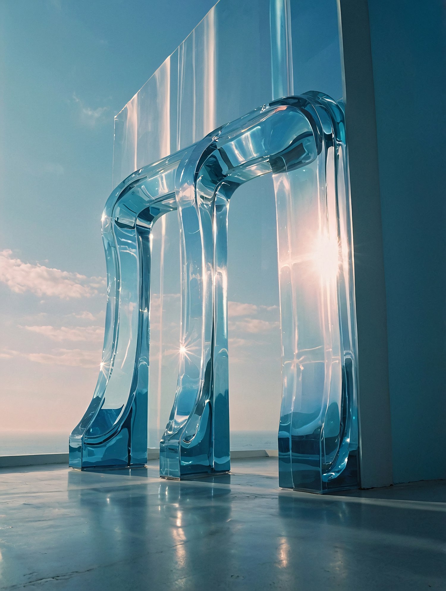 A stunning translucent blue glass structure with fluid curves reflects sunlight against a serene ocean horizon and clear sky.