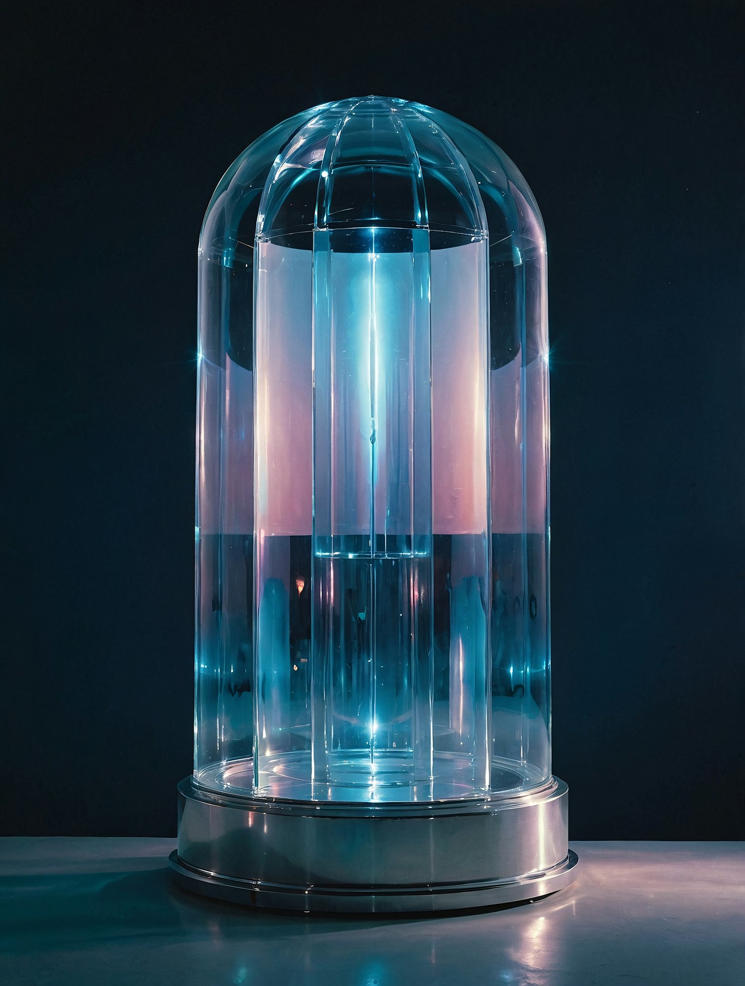A glowing cylindrical glass dome with blue and pink hues, set on a metallic base, exudes a futuristic and sci-fi vibe.