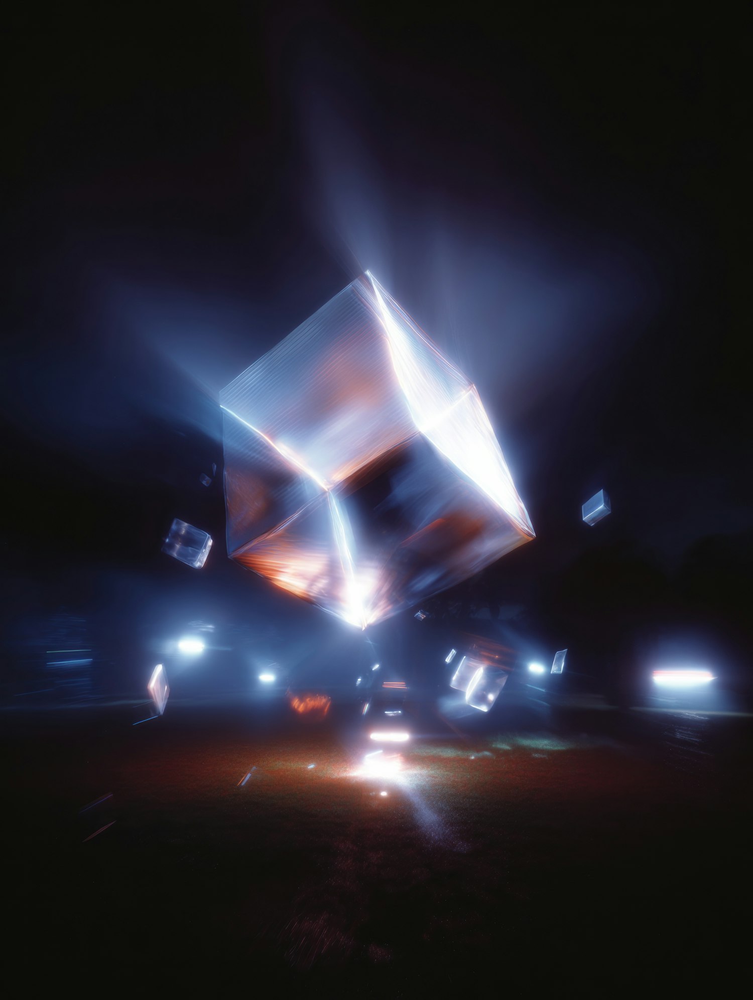 A glowing cube floats in a dark, surreal setting, surrounded by smaller cubes and radiant light in blue and orange hues.