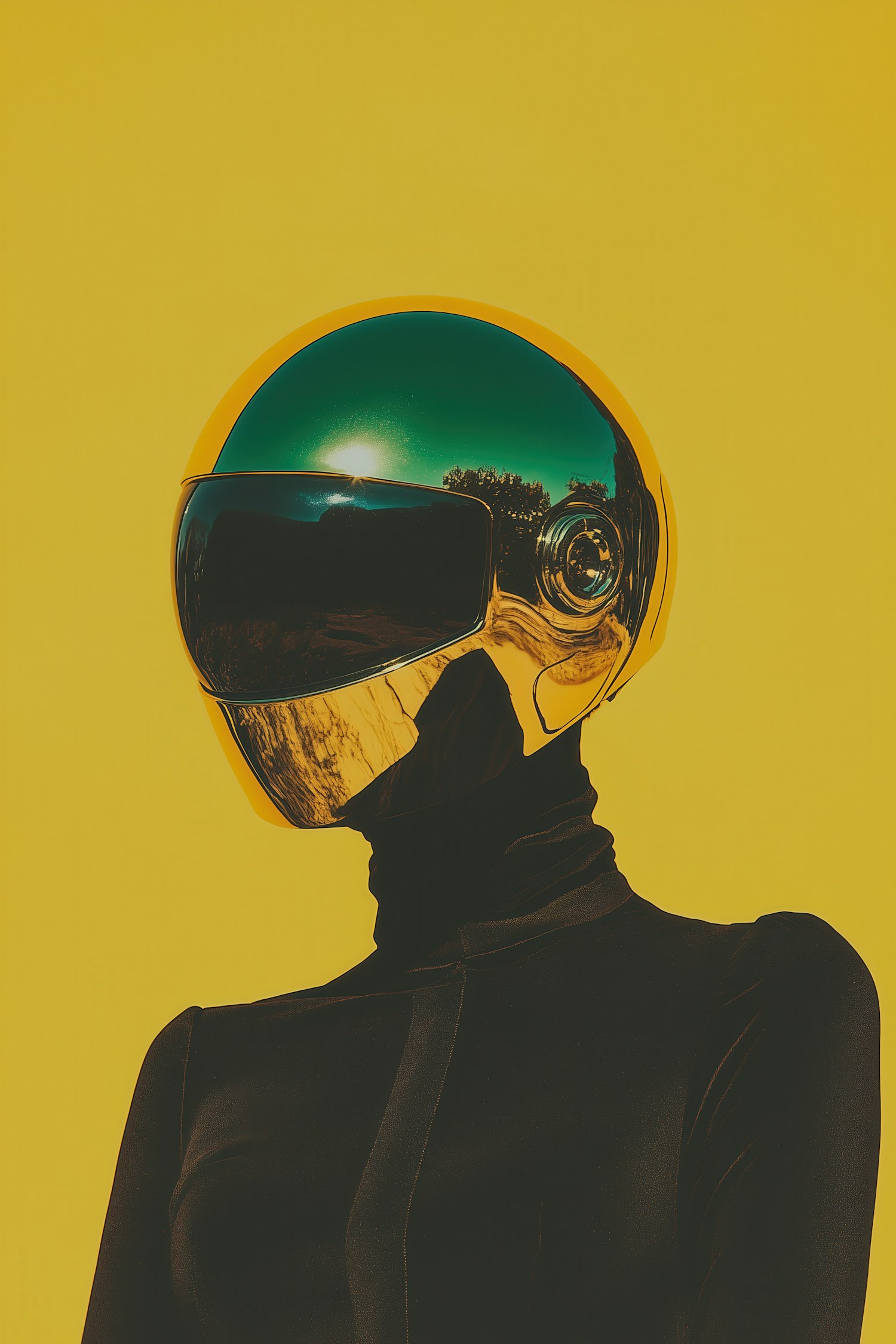 A person in a sleek black outfit and a reflective golden helmet stands against a bold yellow background, blending sci-fi and modern art vibes.