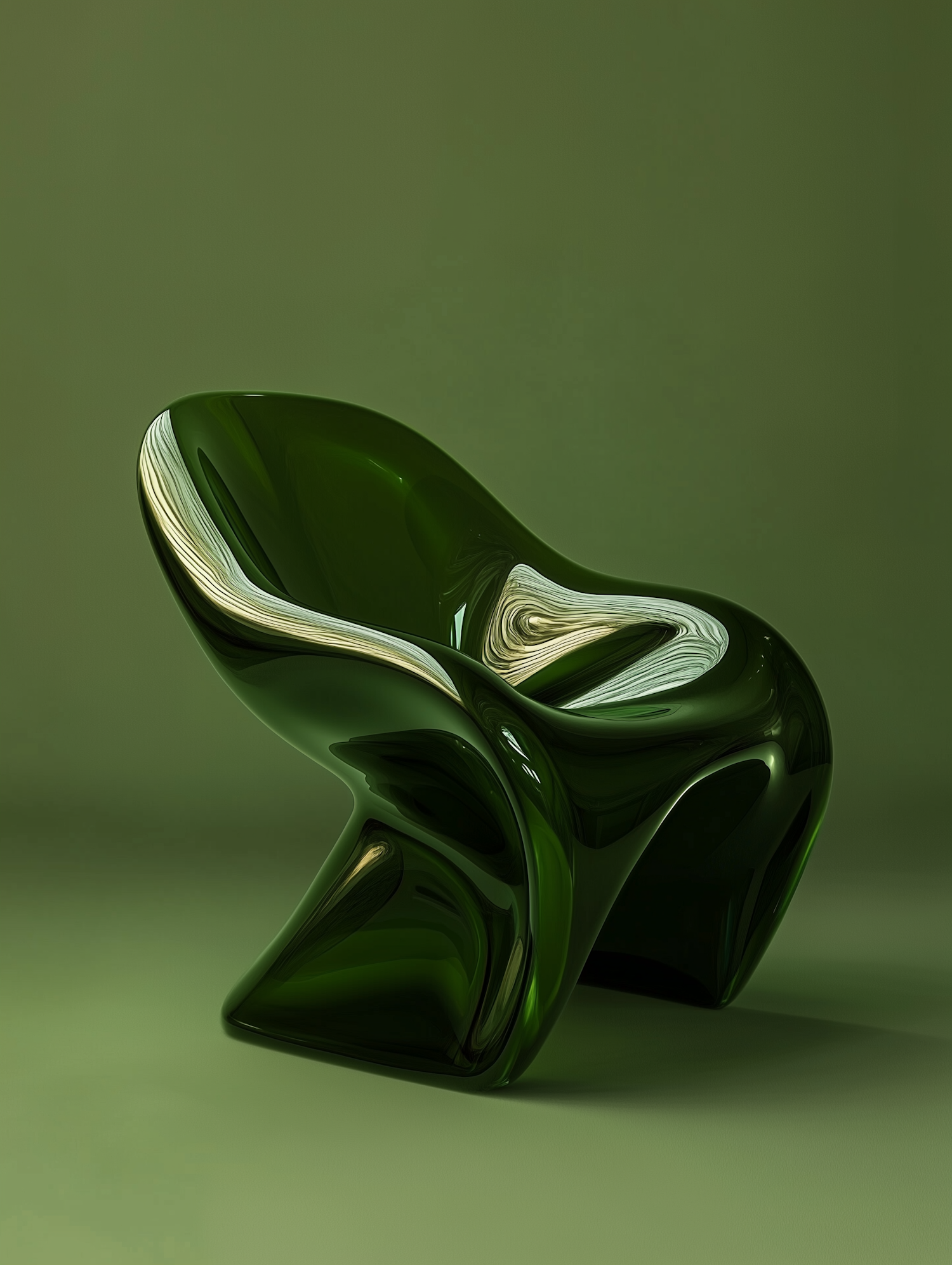 Sleek dark green chair with a glossy finish and futuristic curves, set against a matching green background for a modern, artistic vibe.