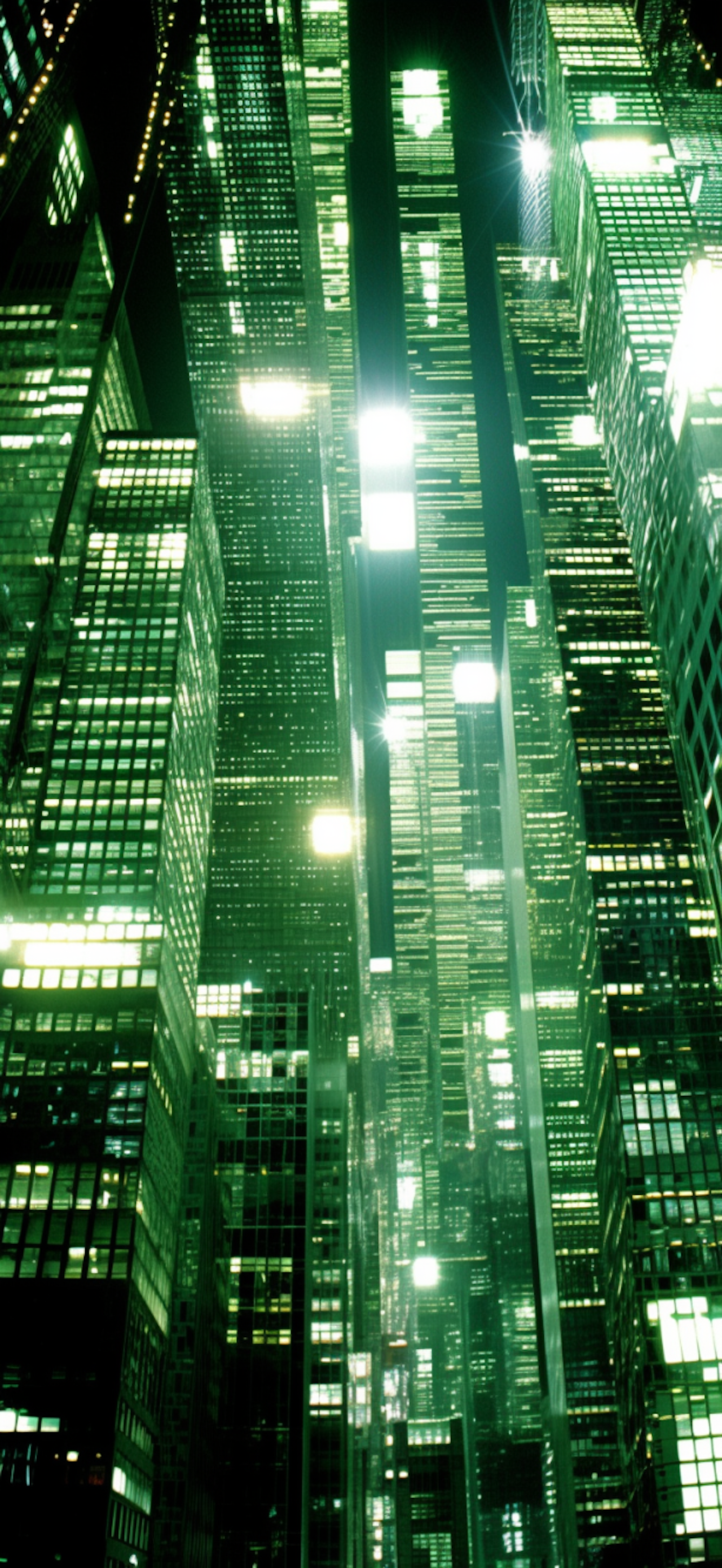 Futuristic cityscape with towering green-lit skyscrapers, creating a vibrant and dynamic urban scene.
