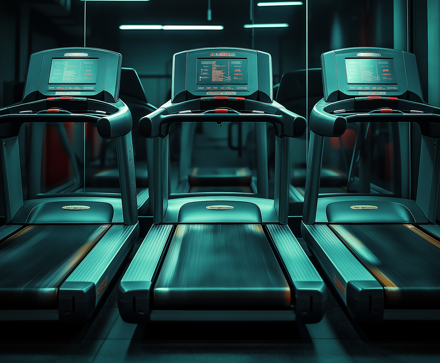 Three sleek treadmills in a dimly lit gym, featuring digital screens and a futuristic ambiance.