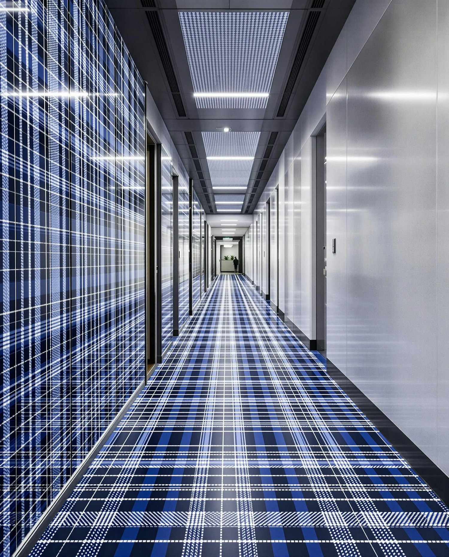 Modern hallway with floor-to-ceiling tartan tile pattern in monochrome blue. Graphic and bold, with strong overhead lighting.