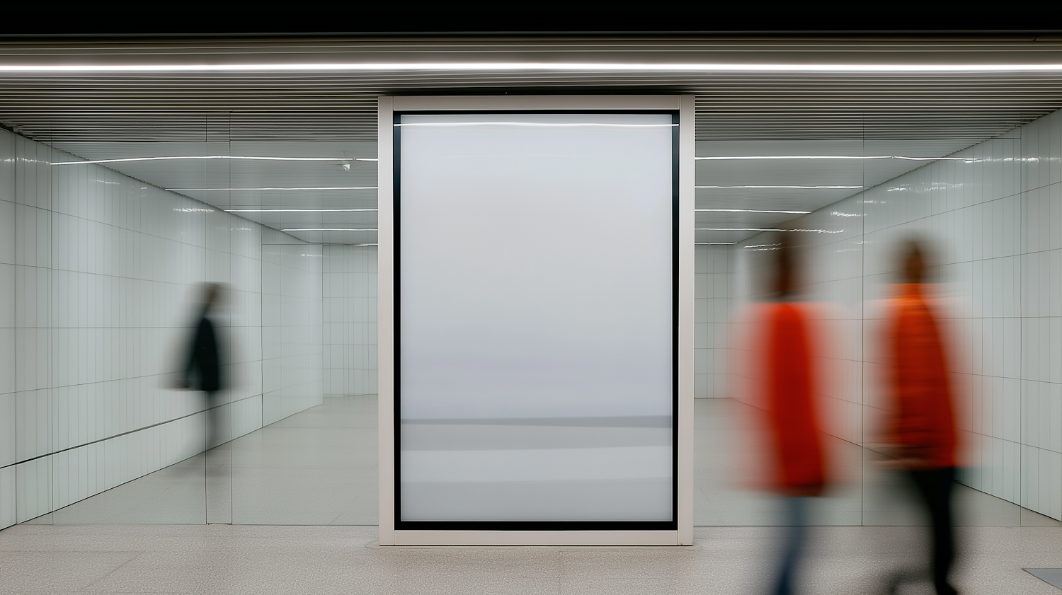 Minimalistic hallway with a blank ad panel, white tiles, and blurred figures in motion, creating a dynamic and modern aesthetic.