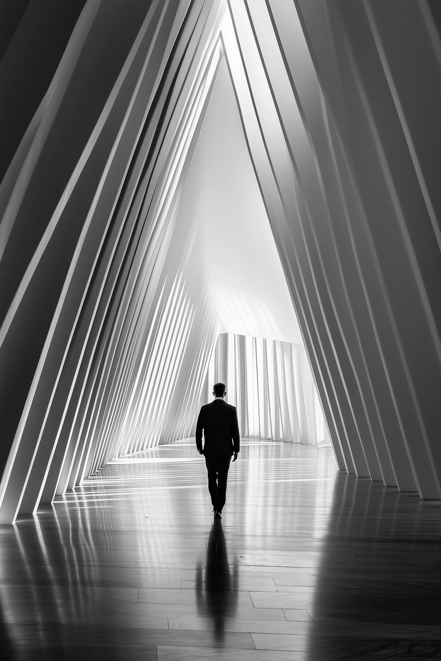 A man in a suit walks through a futuristic hallway with angular, geometric structures and dramatic lighting. Minimalist and modern.