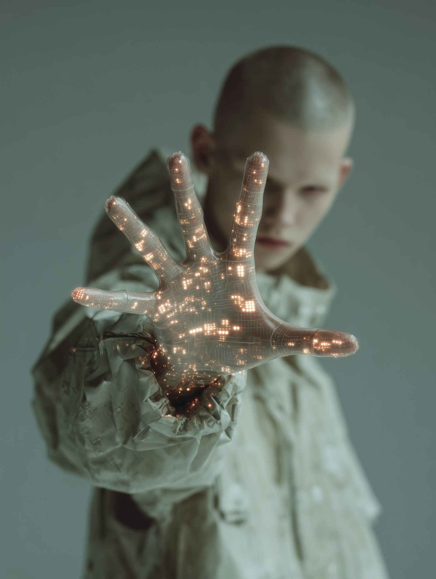 A futuristic scene featuring a person with a glowing, circuit-augmented hand, emphasizing technology and innovation.