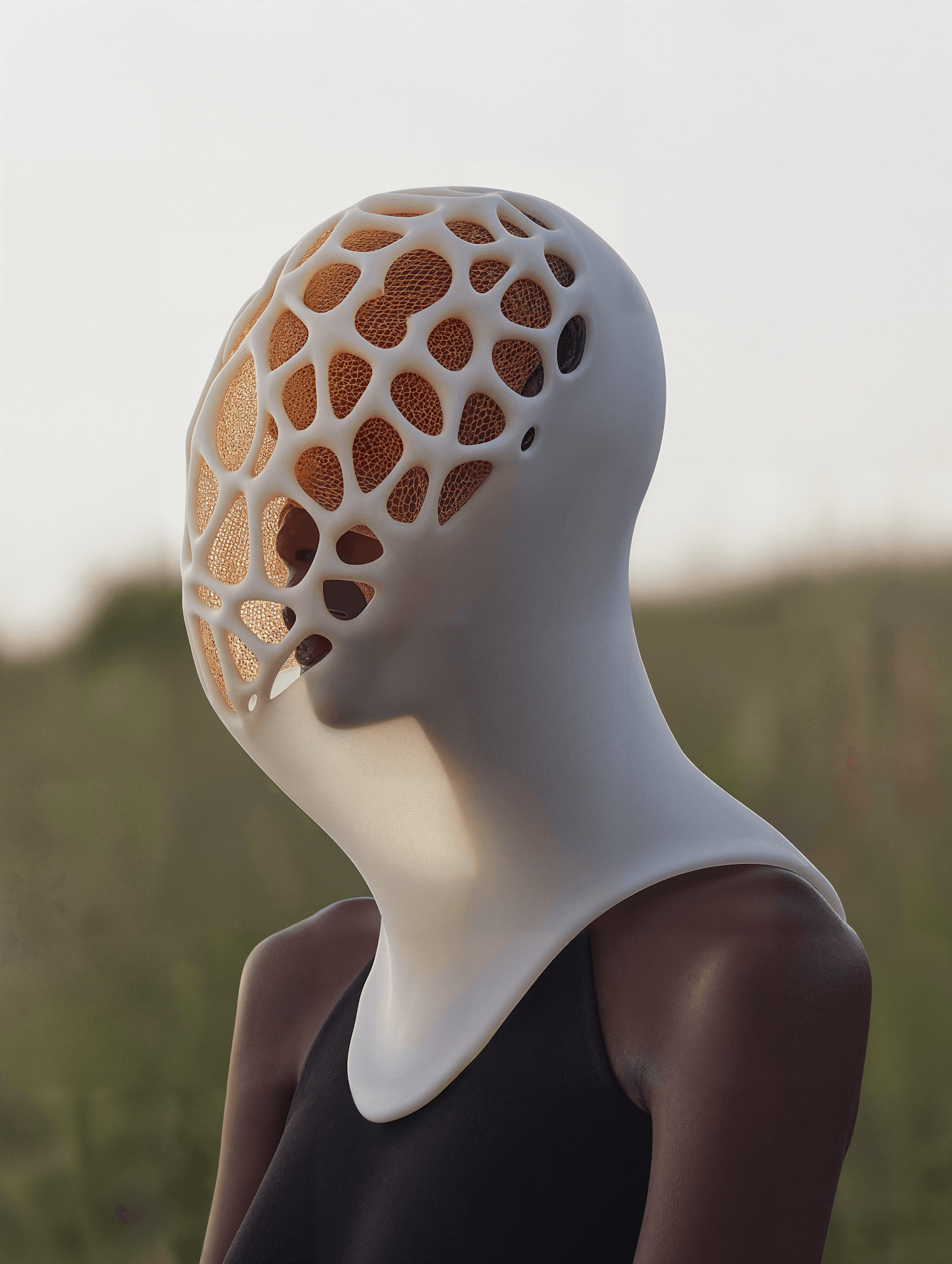 A person in a black top wears a white, lattice-like sculptural headpiece with golden textures inside, set against a softly blurred outdoor background.