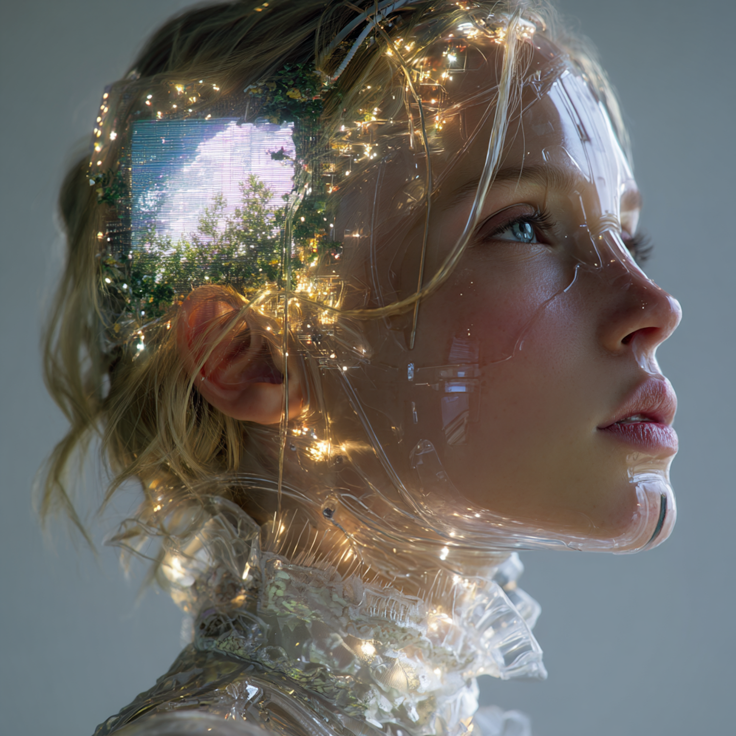 A futuristic portrait of a person with a transparent, illuminated headpiece featuring a digital display of a serene sky and trees.