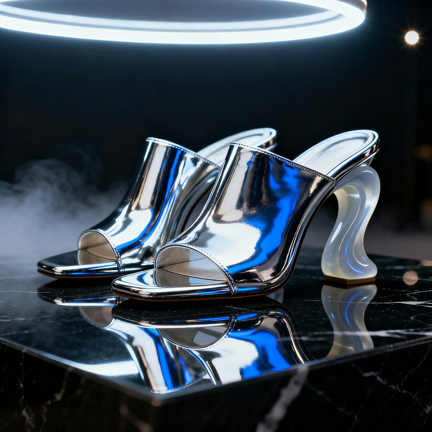 asymmetric open-back mirror-chrome mule with sculptural resin curved heel, feminine contour, polished leather surface catching blue-white reflections, placed as a pair on reflective black marble, fluorescent rim light from above, subtle haze, shallow DOF 85 mm f/1.8, cool silver palette, photoreal 8 k texture, luxury women’s footwear, meta: corporate night still-life, sculptural power elegance
