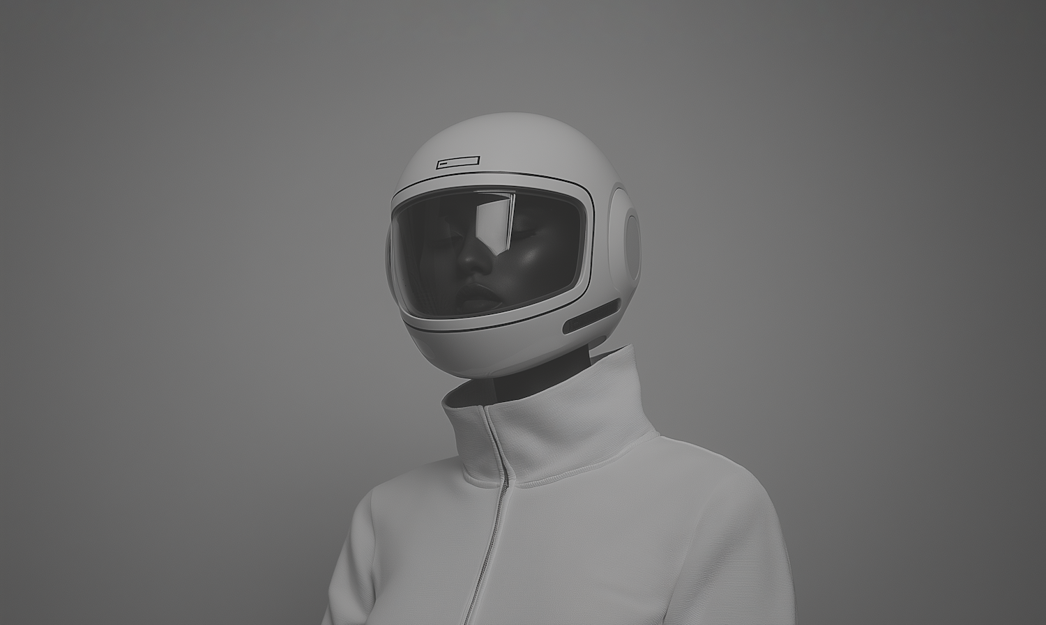 Futuristic mannequin with a sleek white helmet and high-collared garment against a gray background, exuding a minimalist space-age vibe.