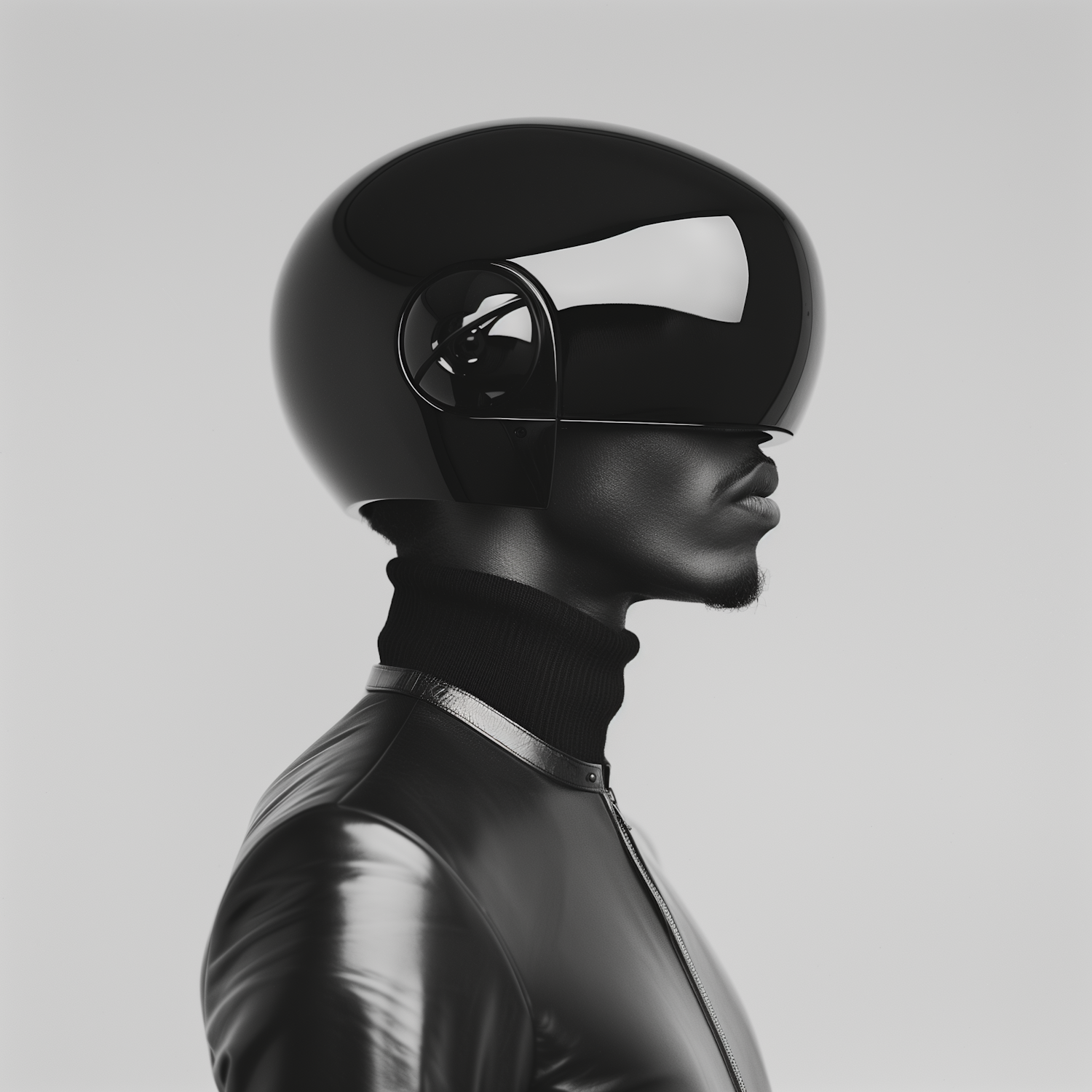 Futuristic portrait of a man in a sleek black helmet and leather jacket, exuding modern sophistication.