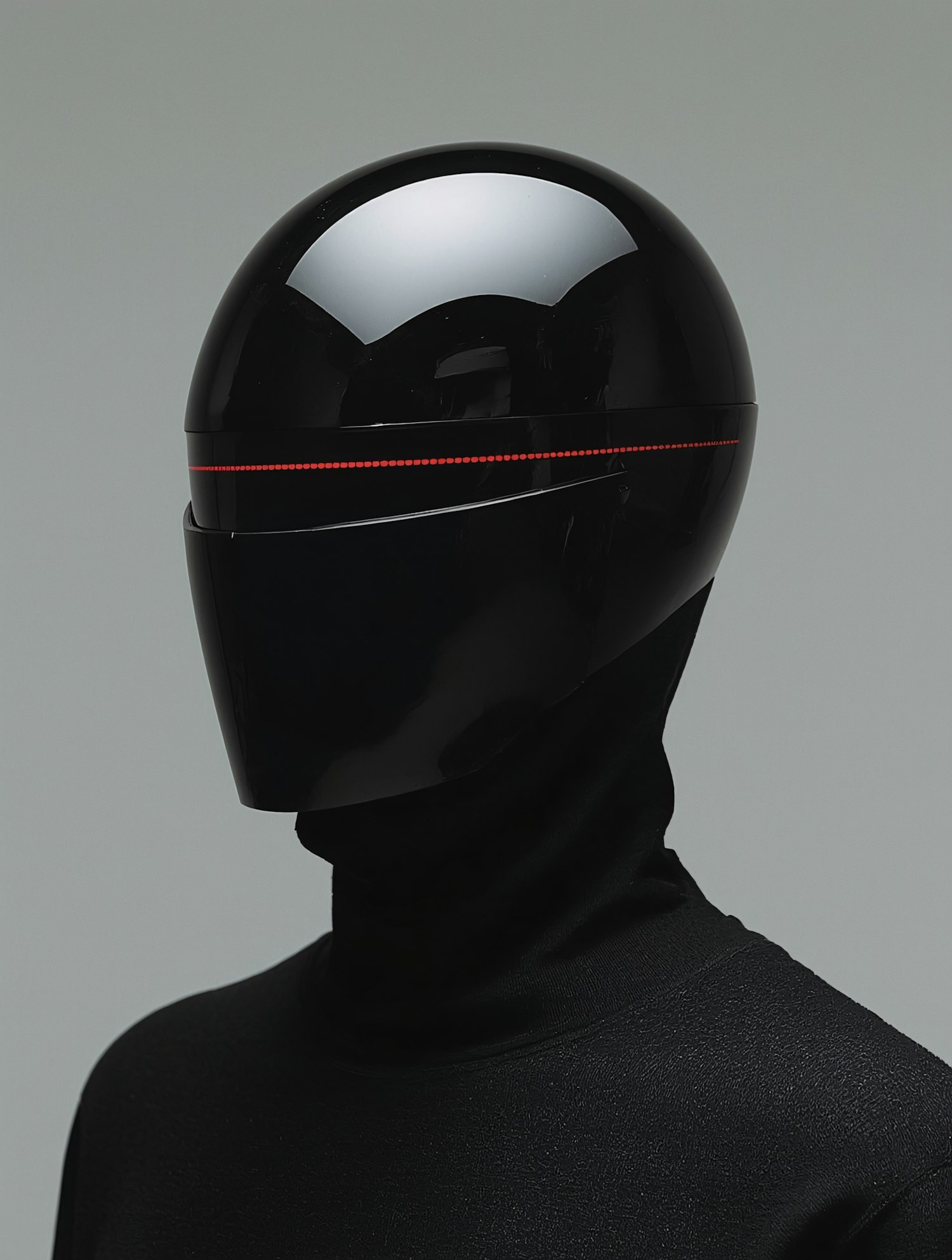 Sleek black futuristic helmet with a red light strip, worn with a black outfit against a neutral gray background.