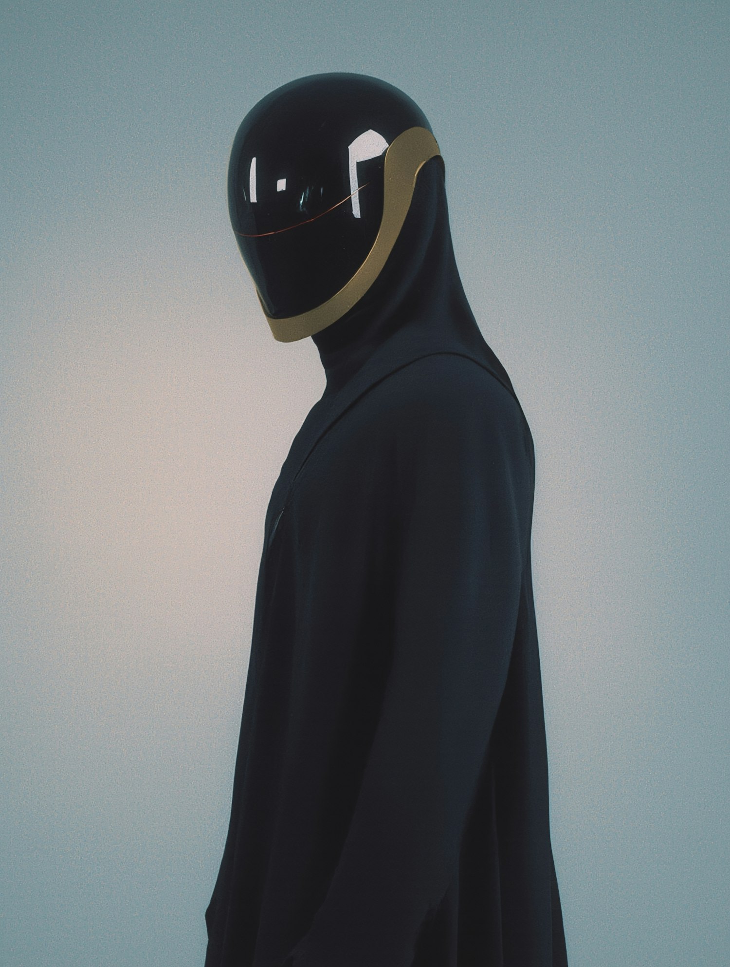 Futuristic figure in a sleek black helmet with gold accents and a dark outfit, set against a clean gradient background.
