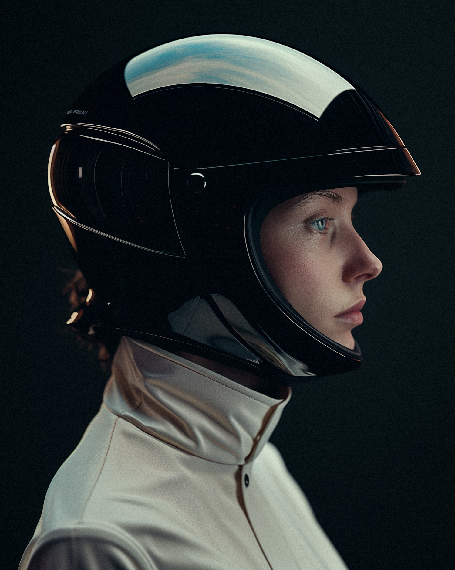 Woman in a sleek black helmet and white high-collared outfit, showcasing a futuristic and modern look against a dark background.