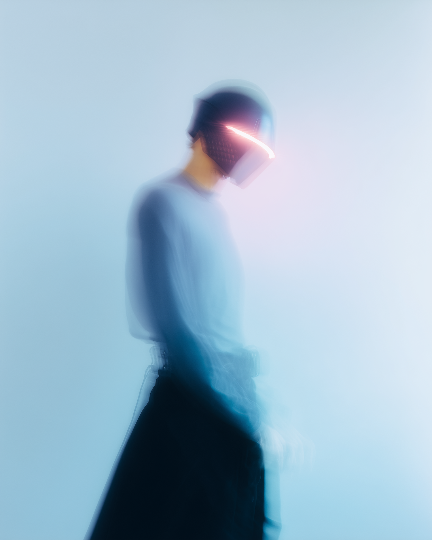 Blurred figure in futuristic helmet with glowing red visor, set against a soft blue gradient background. Dreamlike and modern aesthetic.