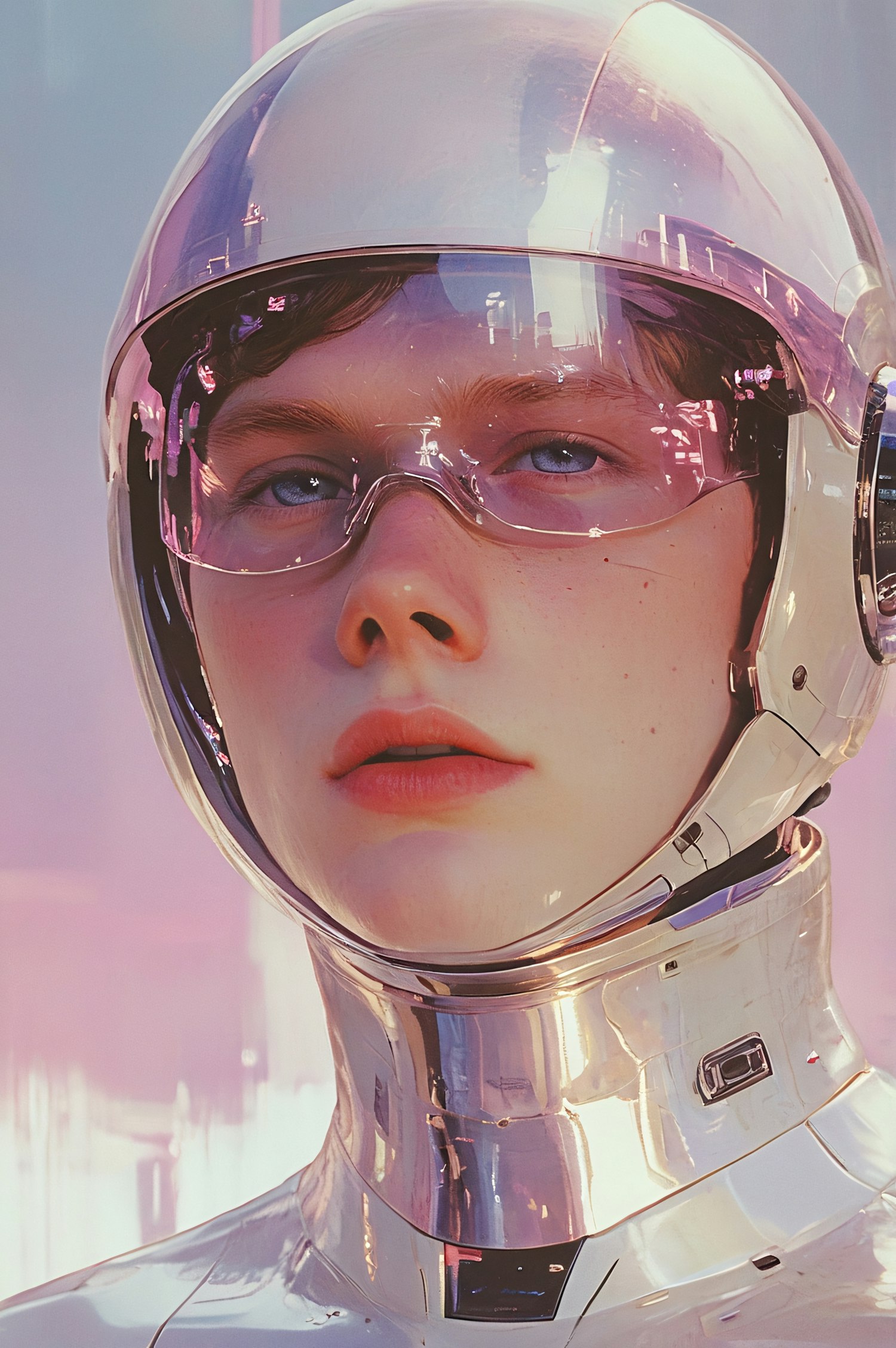 Futuristic portrait of a person in a reflective helmet with a pink and purple glow, exuding a calm and focused expression.