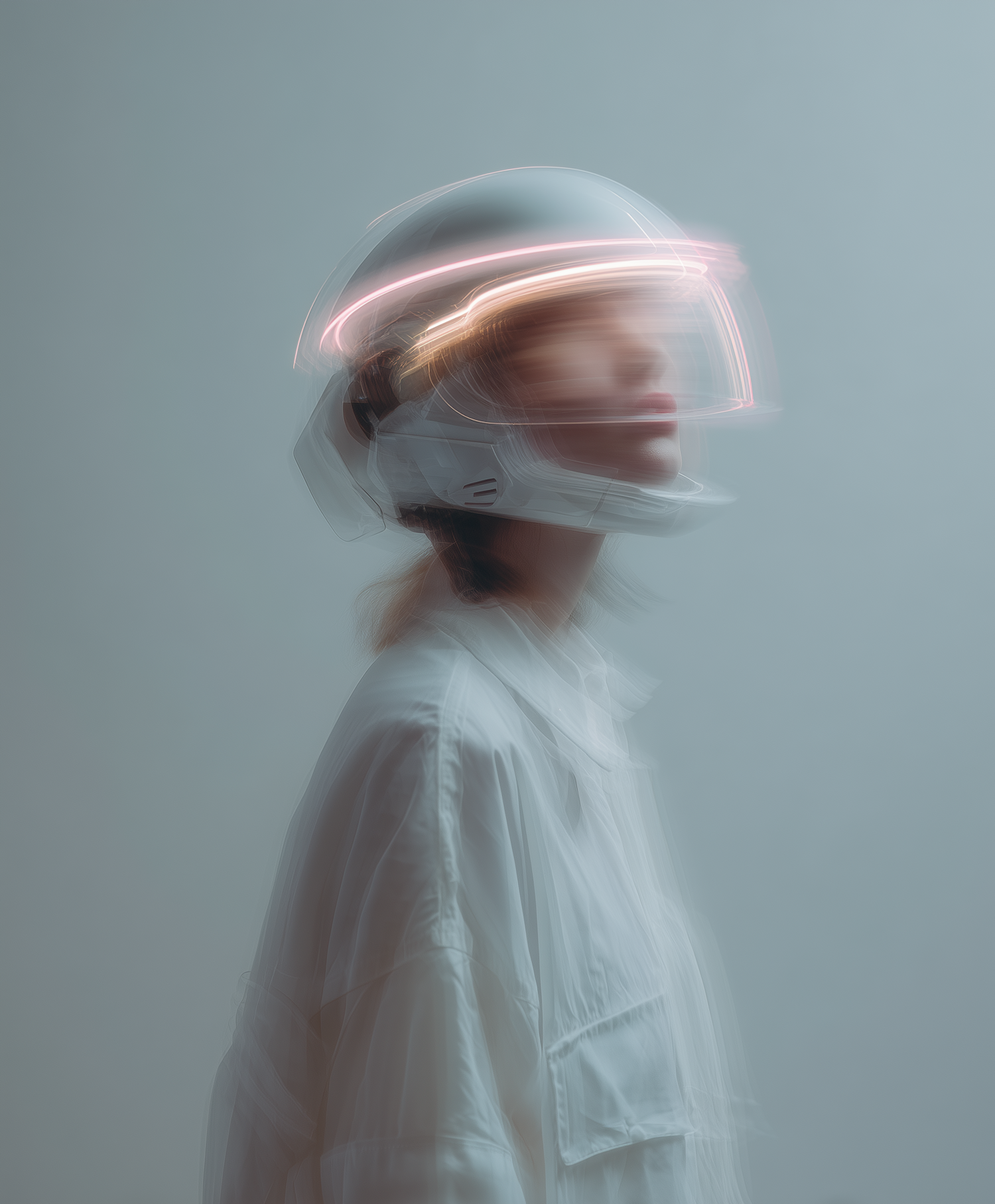 A futuristic helmet with glowing pink lights worn by a person in white, captured with a motion blur for a dynamic, sci-fi aesthetic.