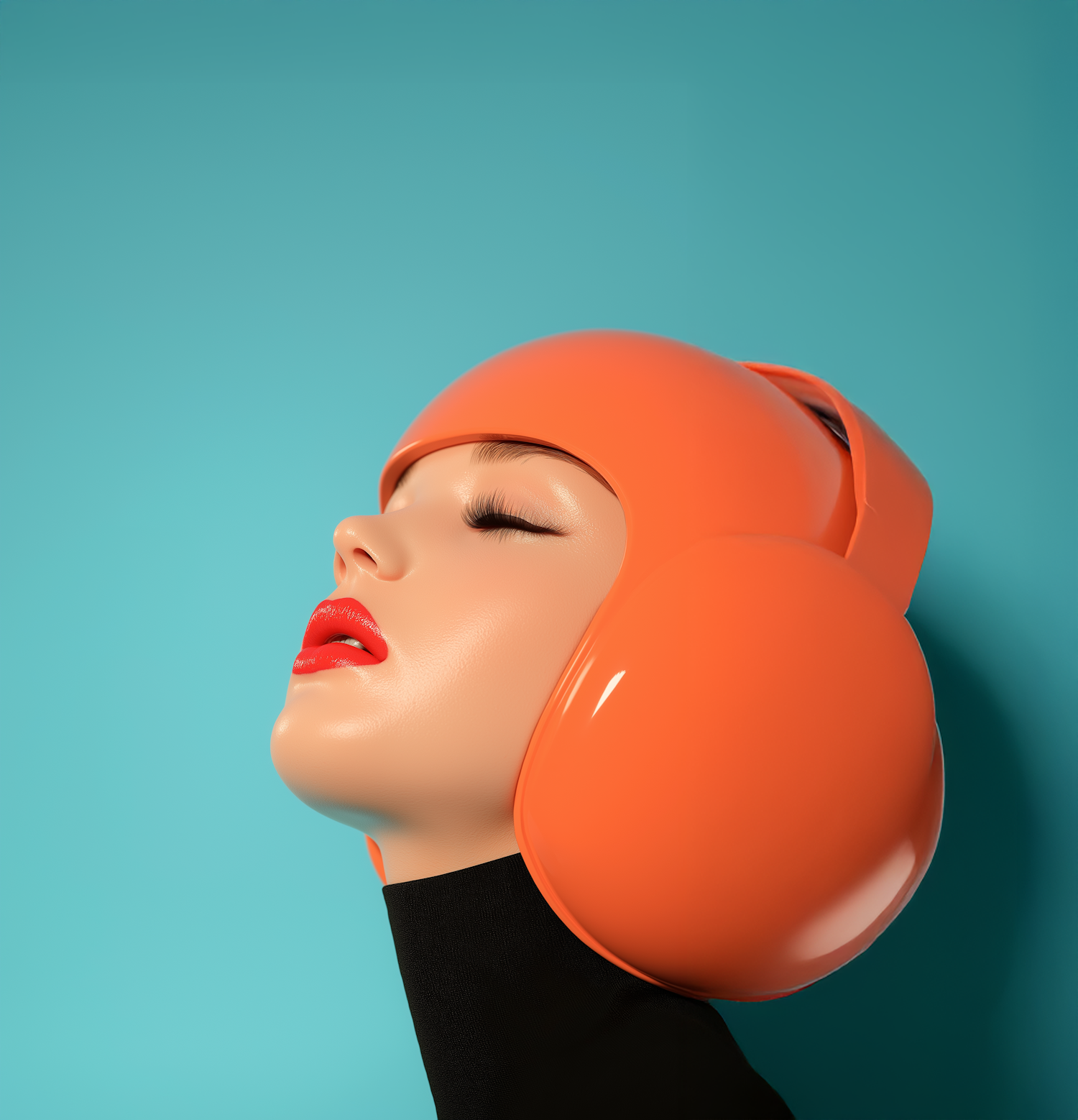 Futuristic portrait of a woman in a glossy orange helmet, bold red lips, and turquoise background, exuding modern elegance.