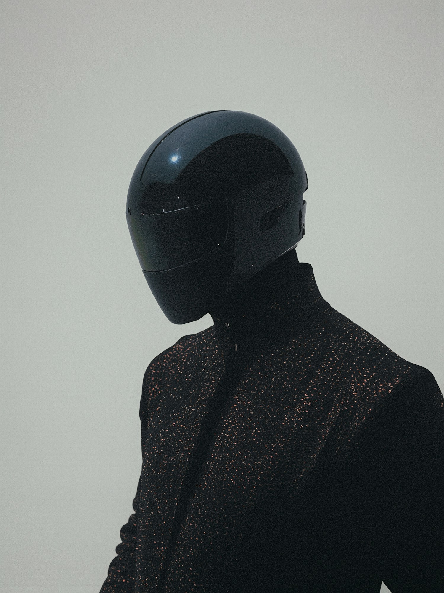 A futuristic figure in a black helmet and textured outfit against a minimalist gray background, exuding a sleek and modern vibe.