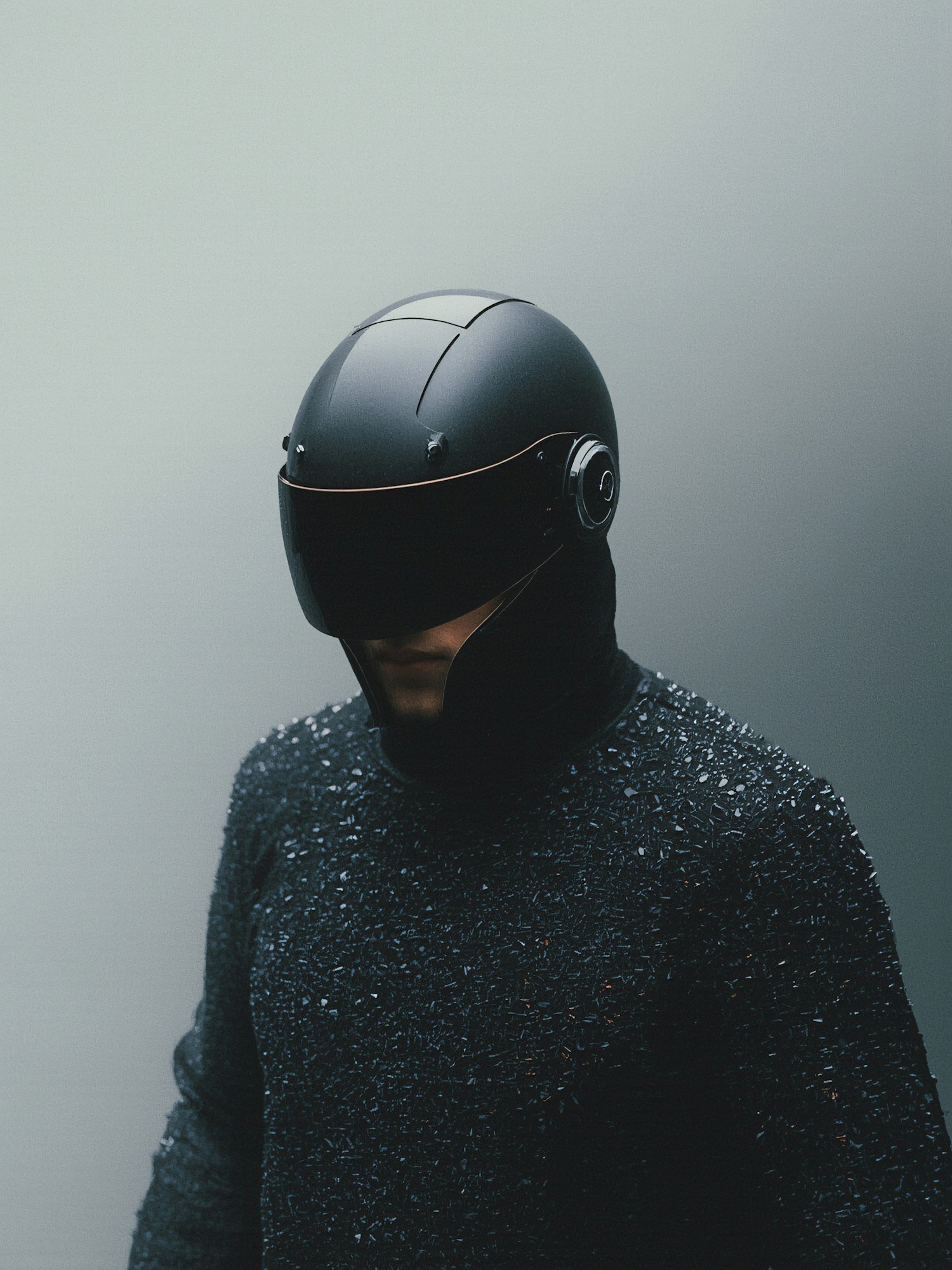 Futuristic individual in a sleek black helmet and textured outfit, set against a minimalist gray background.