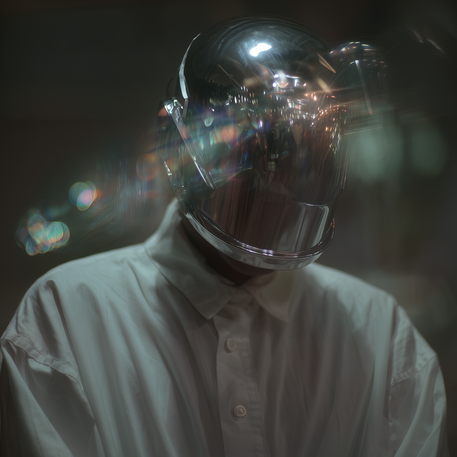 A futuristic helmet reflecting colorful lights, paired with a white shirt, creating a surreal and modern aesthetic.