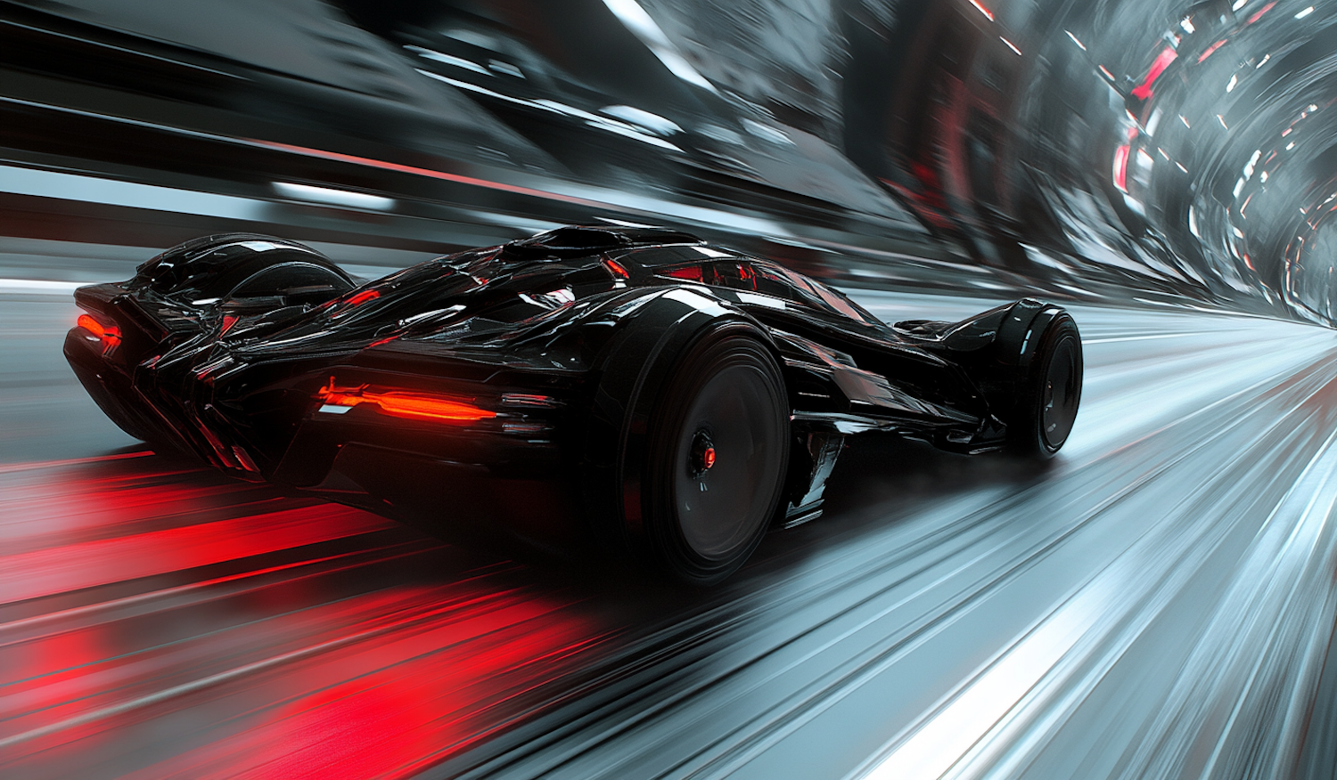 Futuristic black car racing through a tunnel with red light trails, showcasing speed and advanced design.
