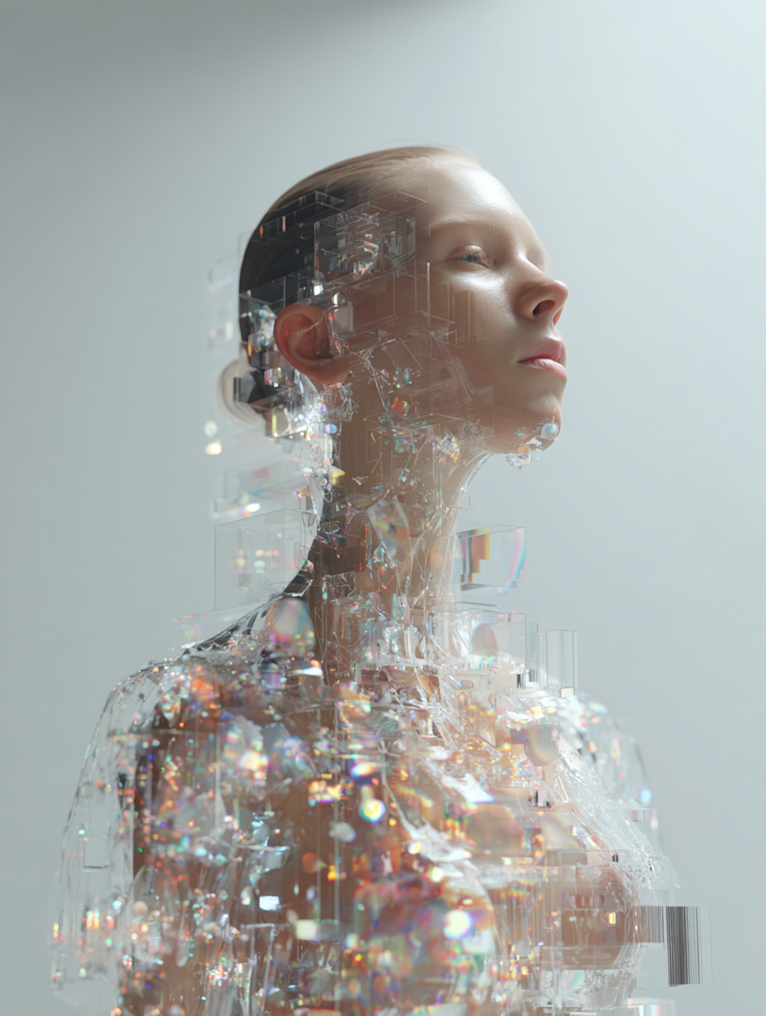 A serene human figure with crystalline, light-refracting elements, blending organic and digital aesthetics in a futuristic style.