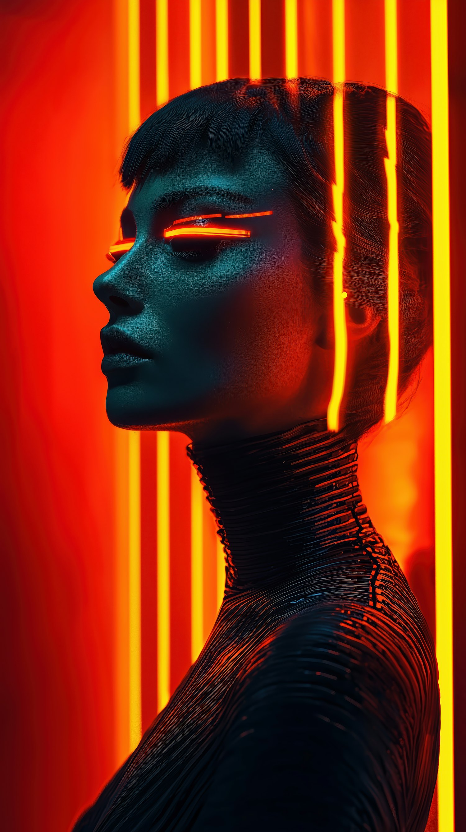 Futuristic portrait with glowing orange eyes and neon lights, featuring a cybernetic aesthetic and vibrant red background.