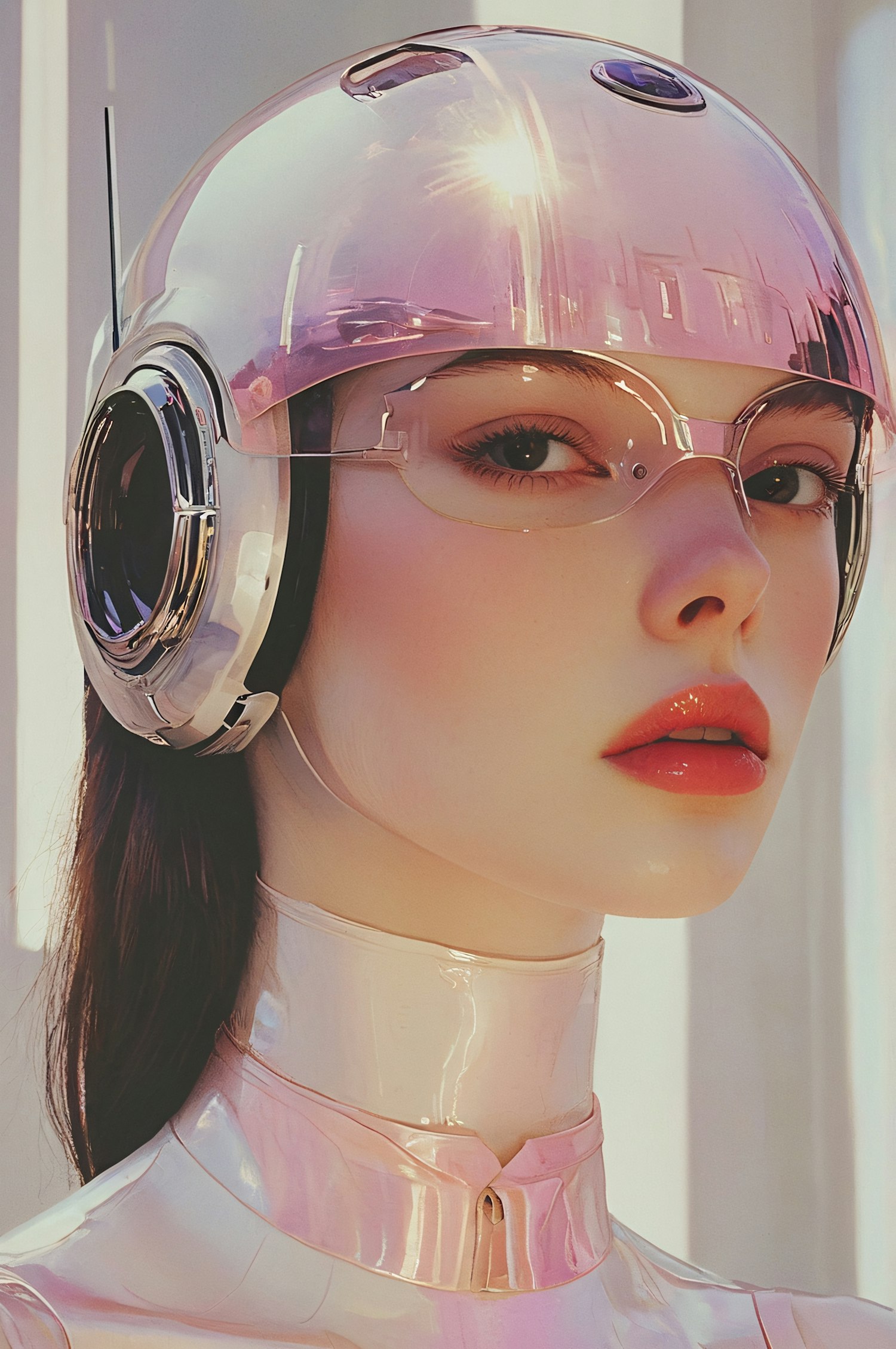 Futuristic portrait of a woman in a glossy pink helmet and transparent glasses, exuding a sleek, modern aesthetic.
