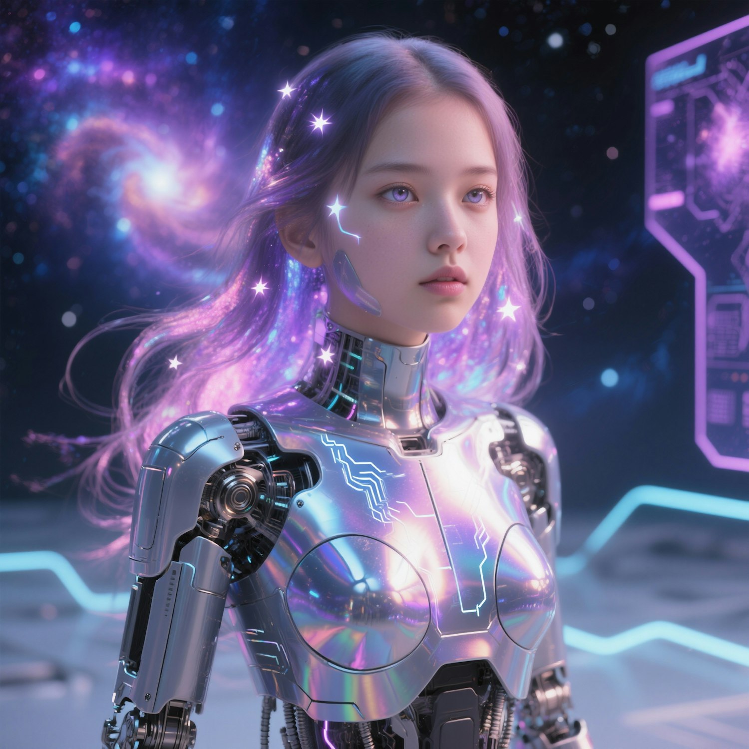 A futuristic humanoid with galaxy-like hair and a sleek robotic body stands against a cosmic background, blending technology and beauty.